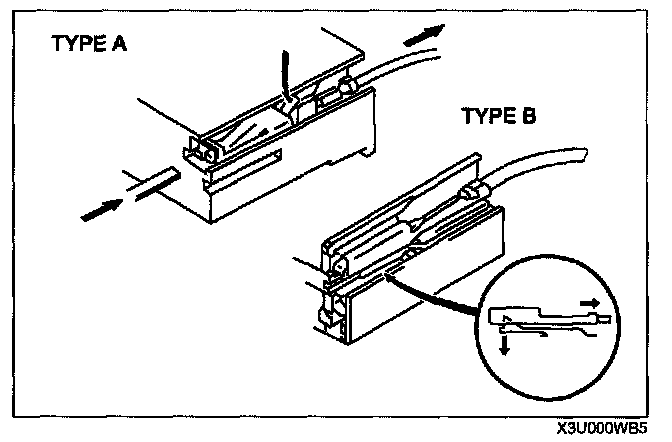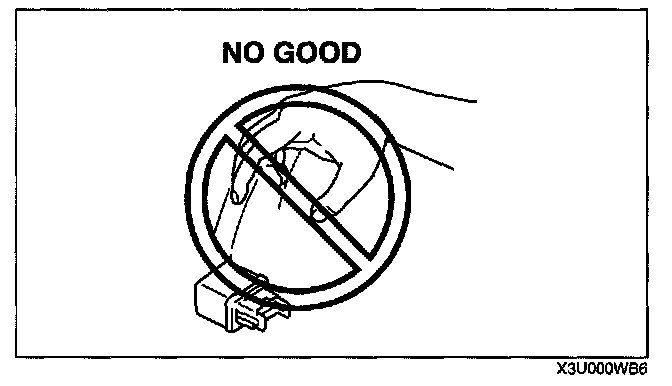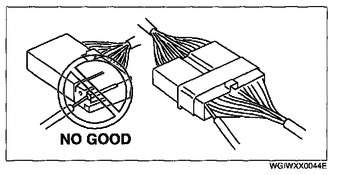 - When a tester is used to inspect for continuity or measuring voltage, insert the tester probe from the wiring harness side.