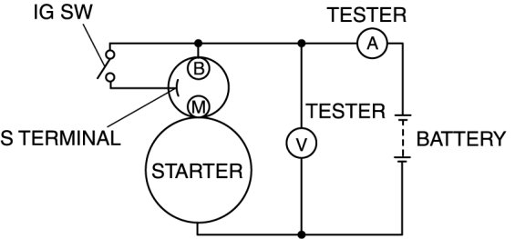 2. Connect the starter, battery, and a tester as shown in the figure.