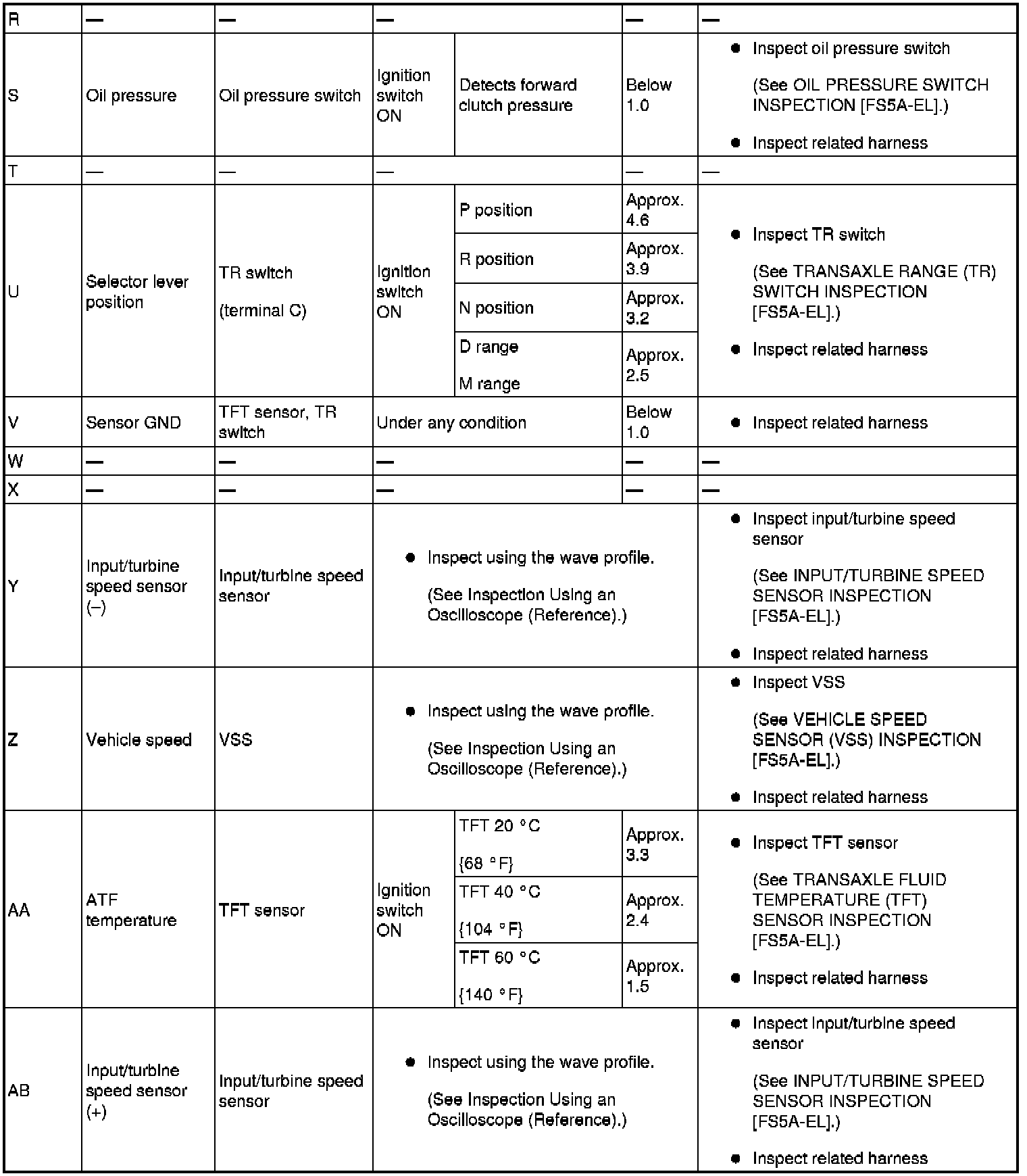 - The TCM terminal voltages vary with changes in measuring and vehicle conditions. Always carry out a total inspection of the input and output systems, and the TCM to determine the cause of trouble. Otherwise, a mis-diagnosis could occur.