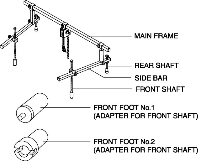 d. Install front foot No.2 to the left front shaft of the SST, then align the groove of the left front shaft of the SST with the folded up part of the vehicle frame (Identical position to right side).