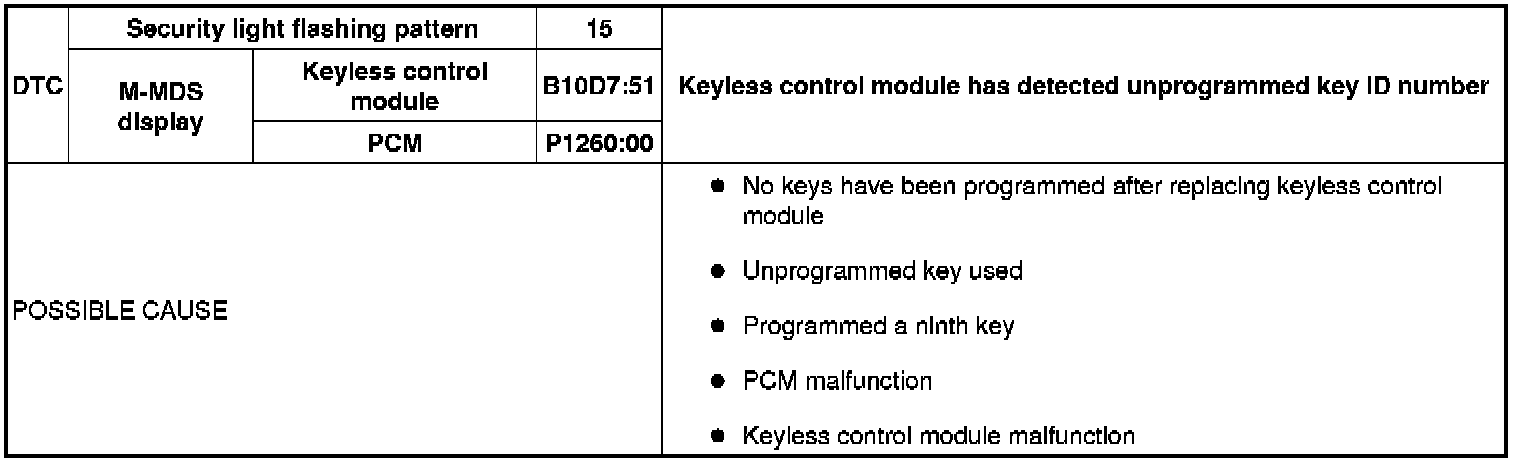 SECURITY LIGHT: 15, DTC: B10D7:51/P1260:00 [IMMOBILIZER SYSTEM (ADVANCED KEYLESS ENTRY AND PUSH BUTTON START SYSTEM)]