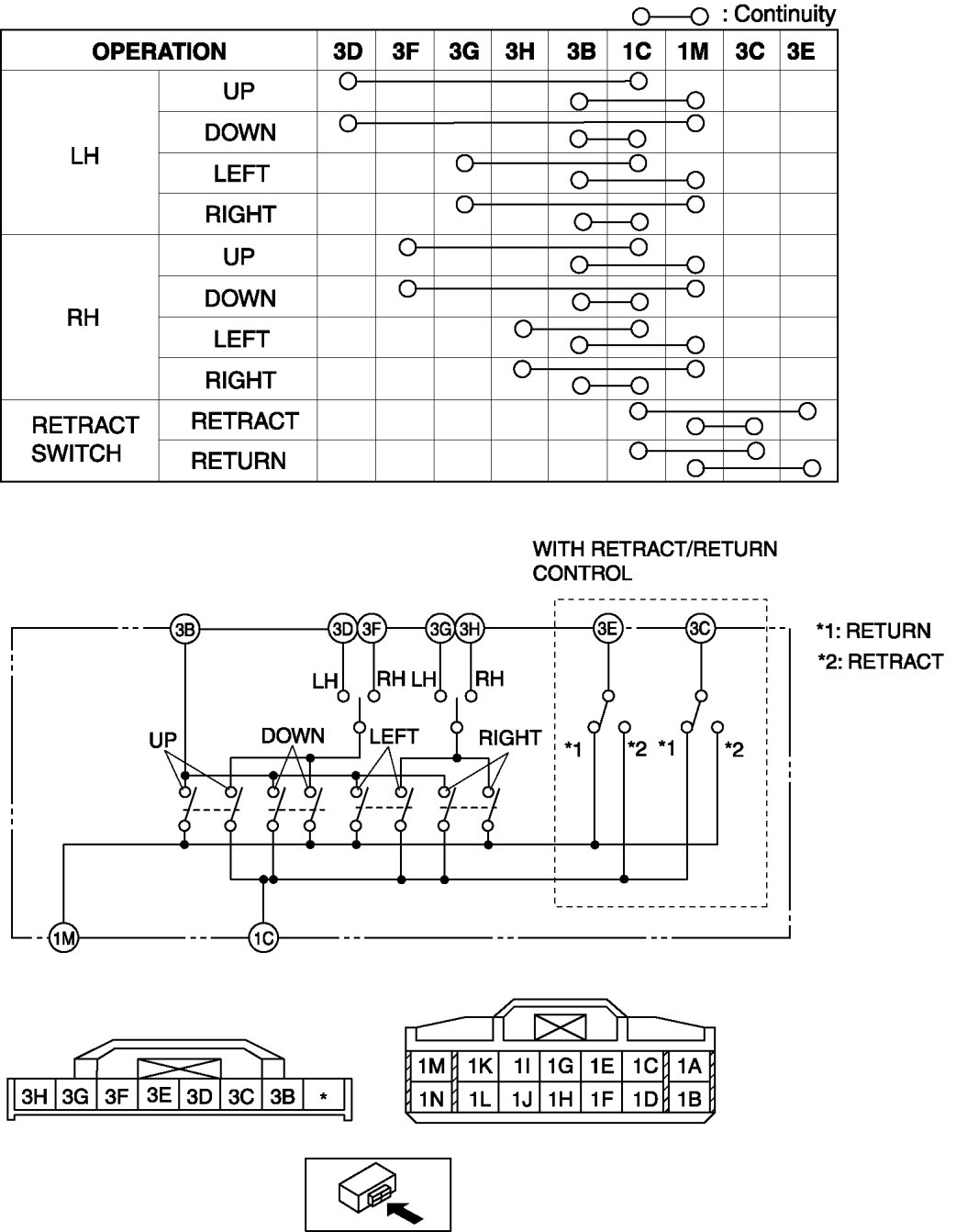 7. Using a tester, verify that the continuity between the power outer mirror switch terminals is as indicated in the table.