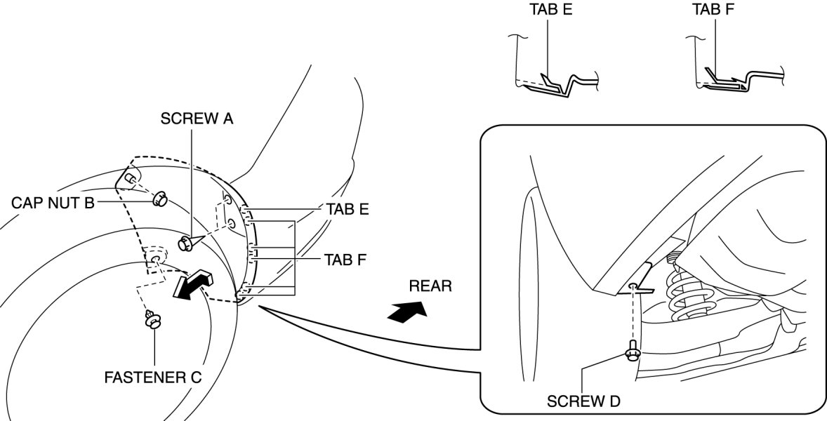 2. Pull the splash shield in the direction of the arrow shown in the figure then remove the tab E and F.