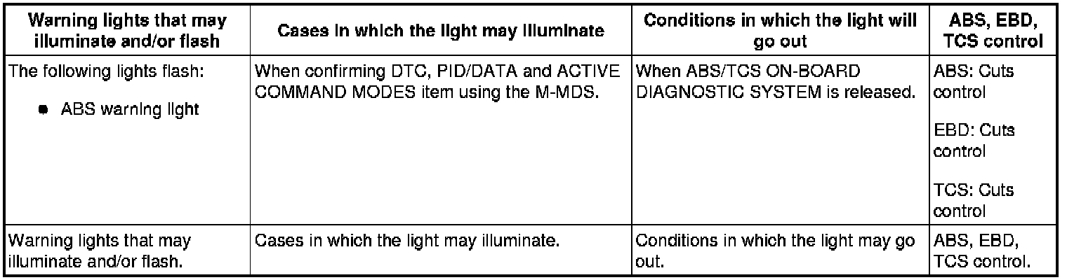 1. The ABS warning light and/or brake system warning light and/or TCS indicator light and/or TCS OFF light illuminate even when the system is normal.