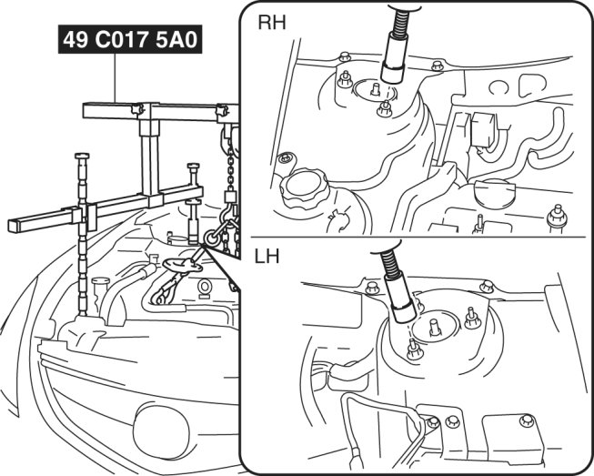 a. As shown in the figure, set the rear shafts of the SST to the left and right shock absorber bolts.