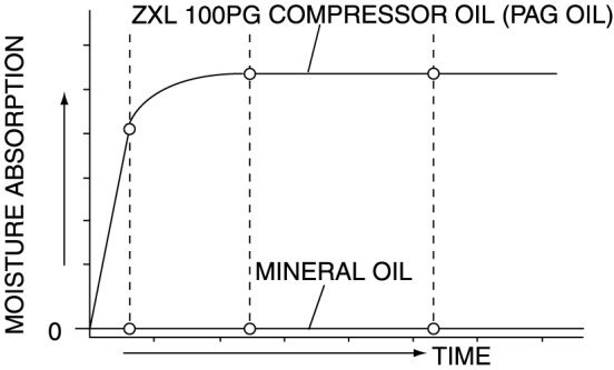 - ZXL 100PG compressor oil (PAG oil) has a higher moisture absorption efficiency than the previously used mineral oil. If moisture mixes with the compressor oil, the refrigerant system could be damaged. Therefore, install caps immediately after using the compressor oil or removing refrigerant system parts to prevent moisture absorption.
