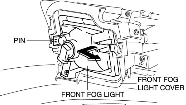 4. Pull the front fog light in the direction of the arrow shown in the figure and remove the pin from the front fog light cover.