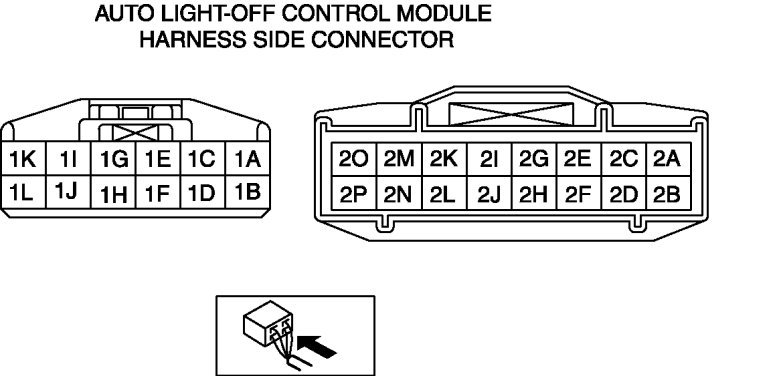 1. Measure the voltage at the auto light-off control module terminals as indicated below.