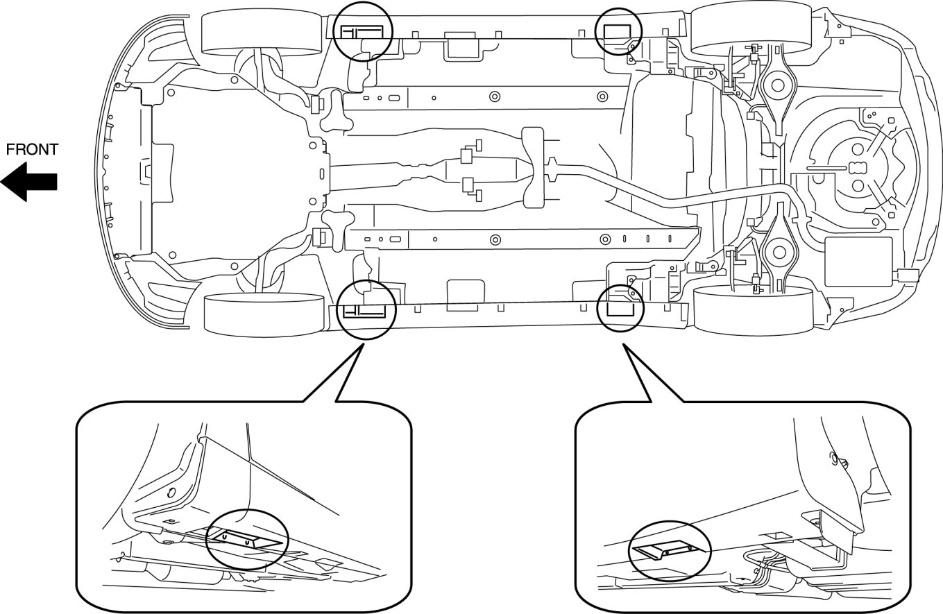 - Both sides of the vehicle, on side sills.