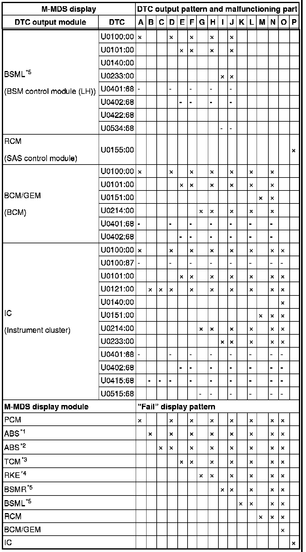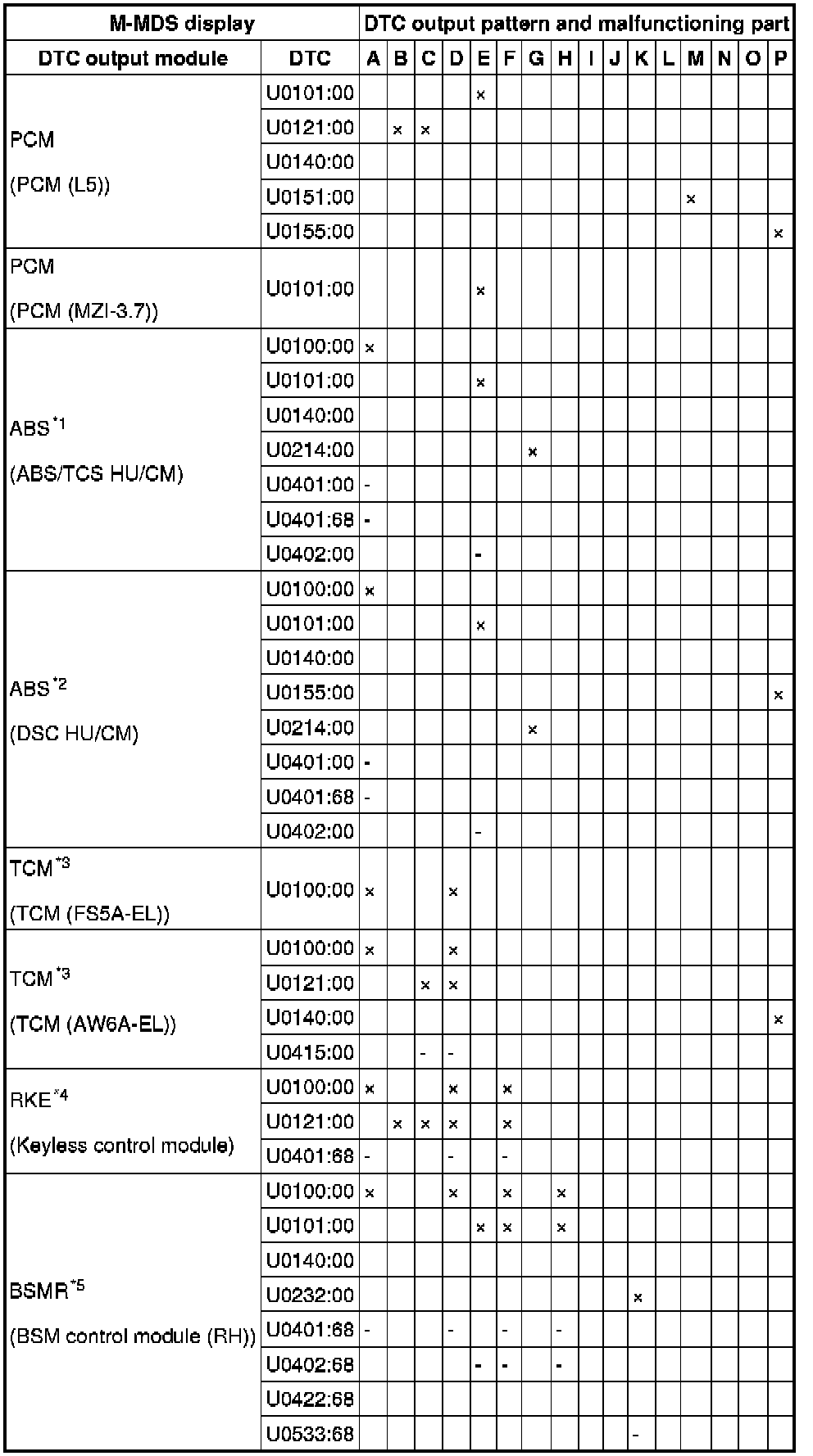 - A hyphen (-) in the DTC output pattern cell indicates that the DTC may be displayed depending on the malfunction detection conditions. If it is not displayed, the malfunctioning part can be determined by checking only the crosses (x).