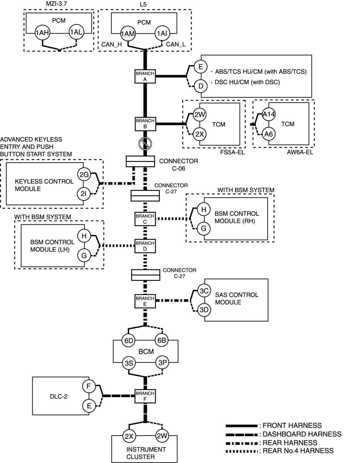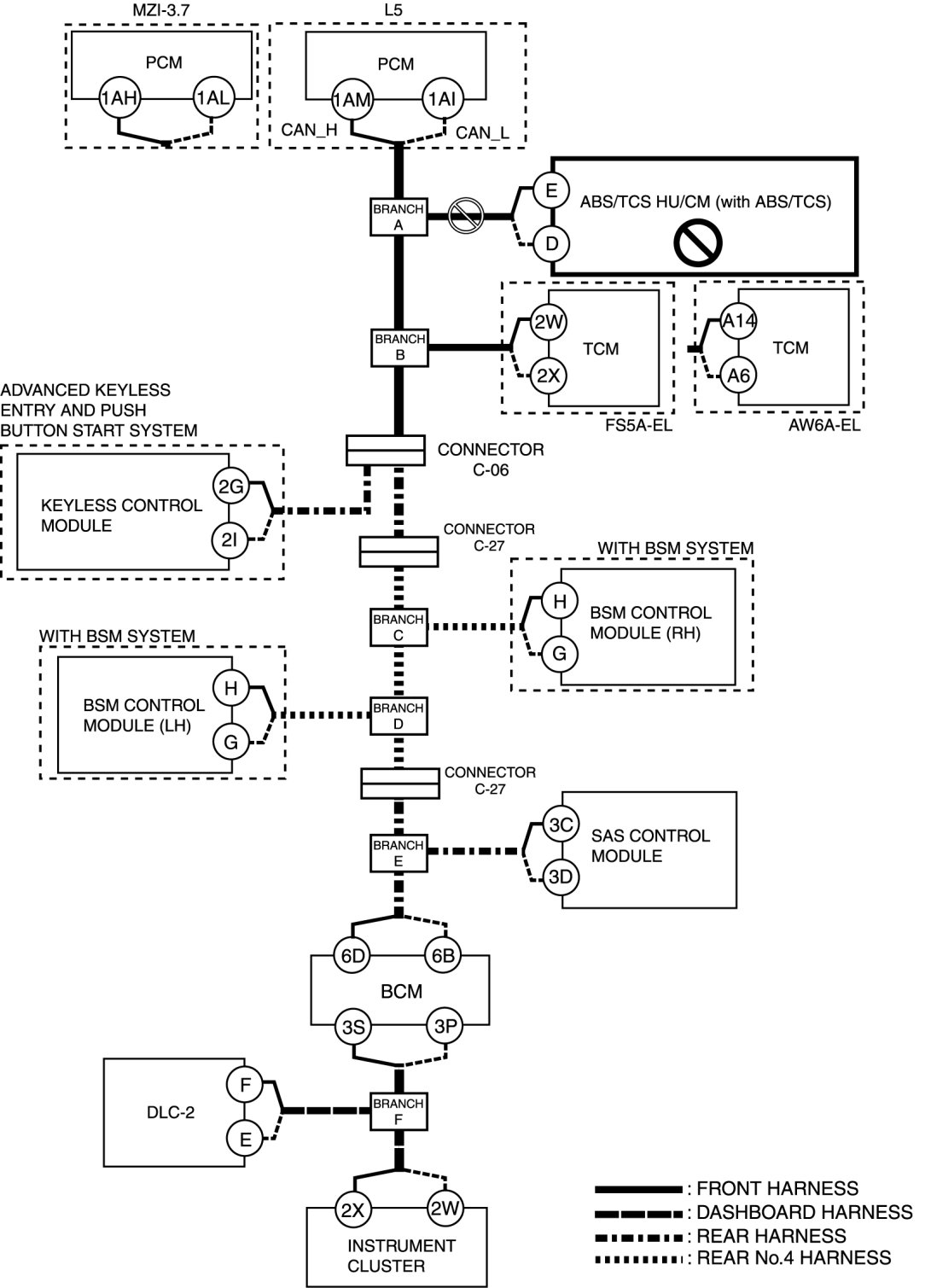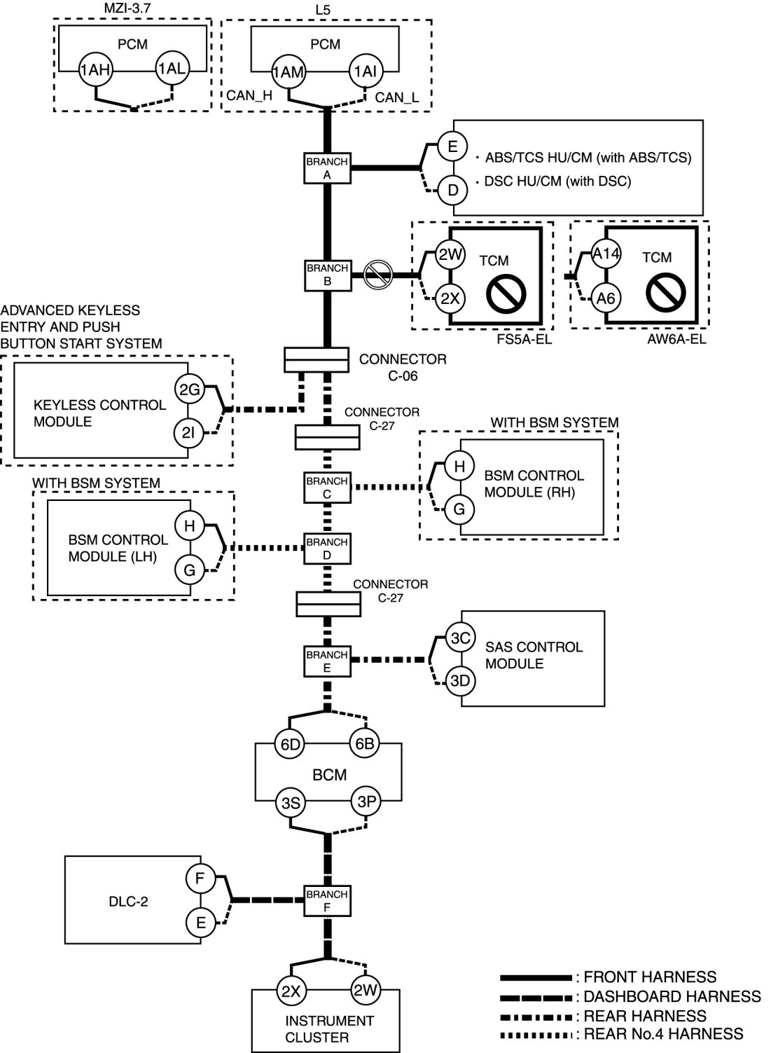 - Wiring harness between TCM terminal 2W and branch B (FS5A-EL)