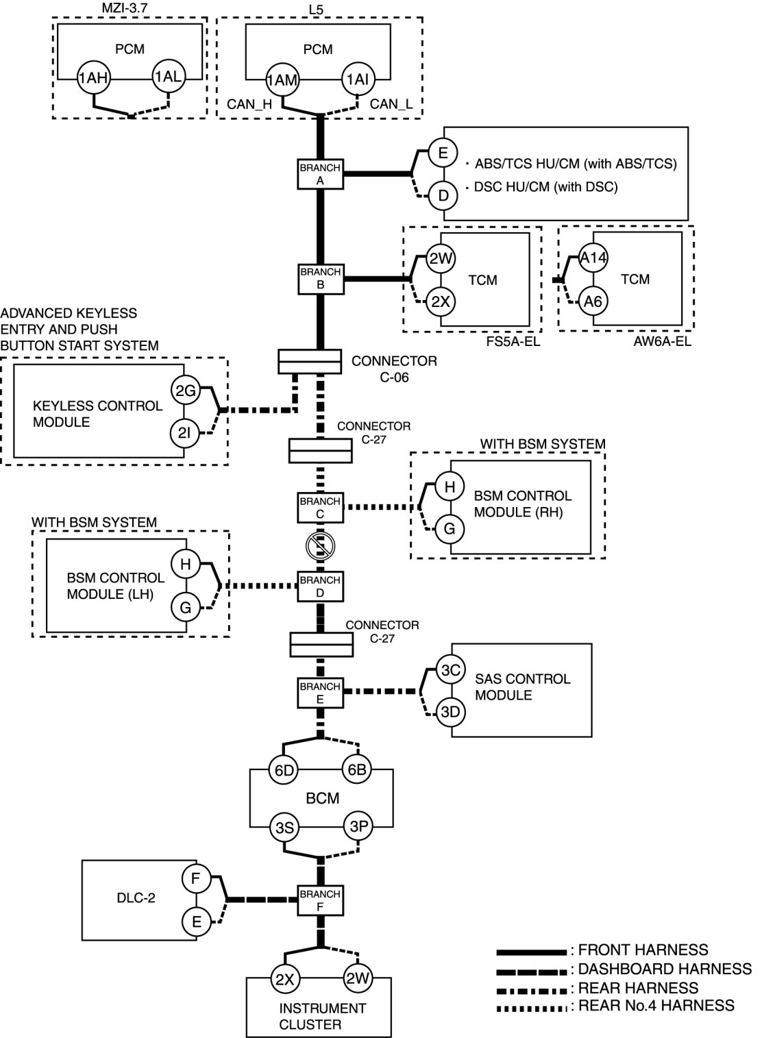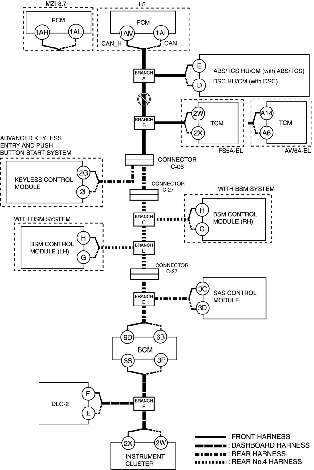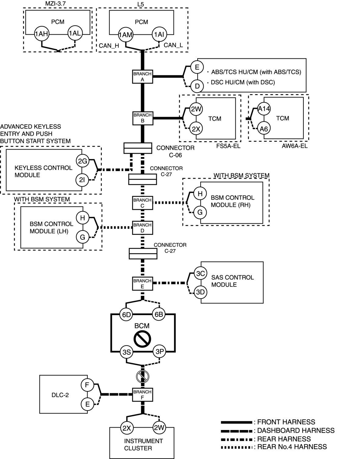 - Wiring harness between TCM terminal 2W and branch B (FS5A-EL)
