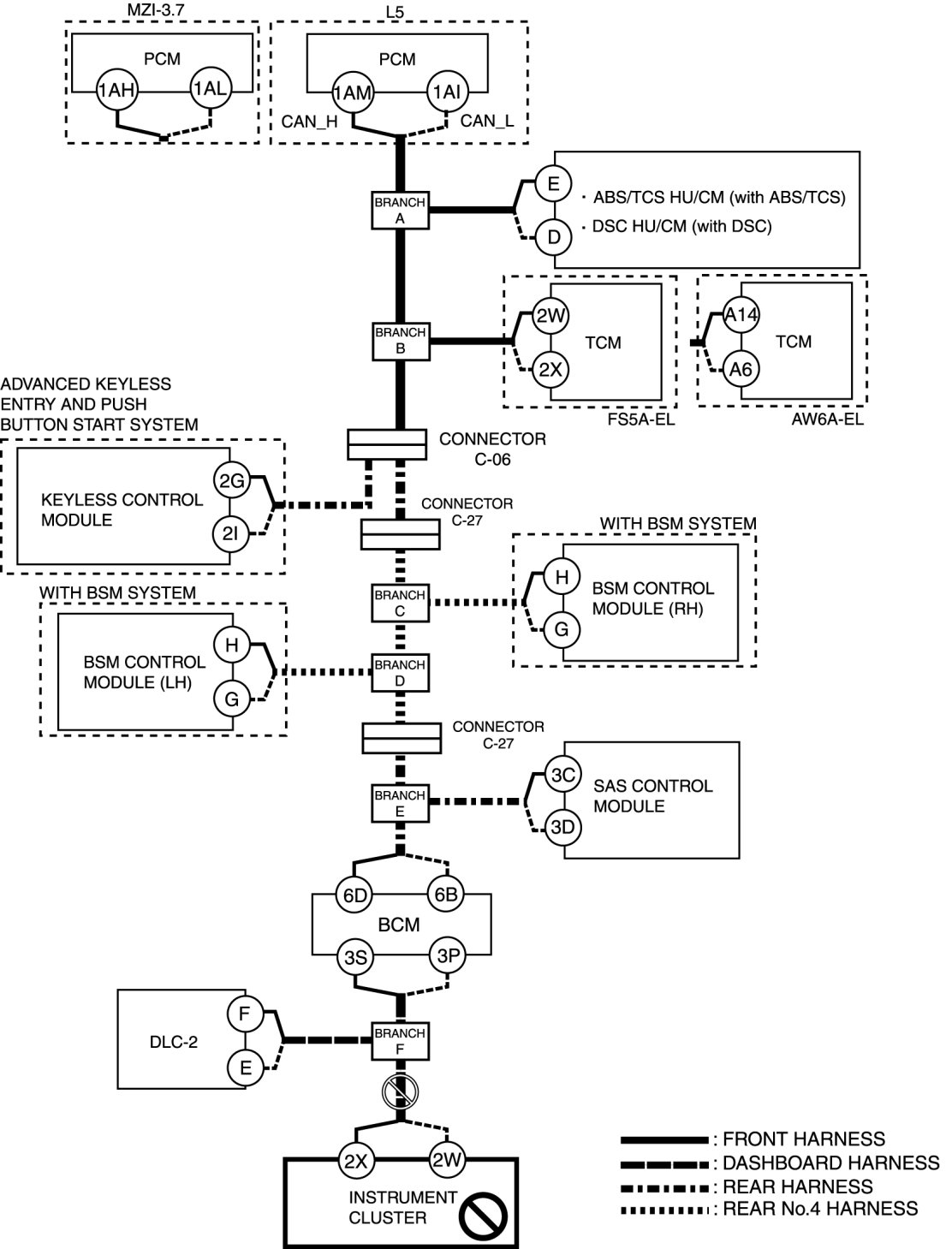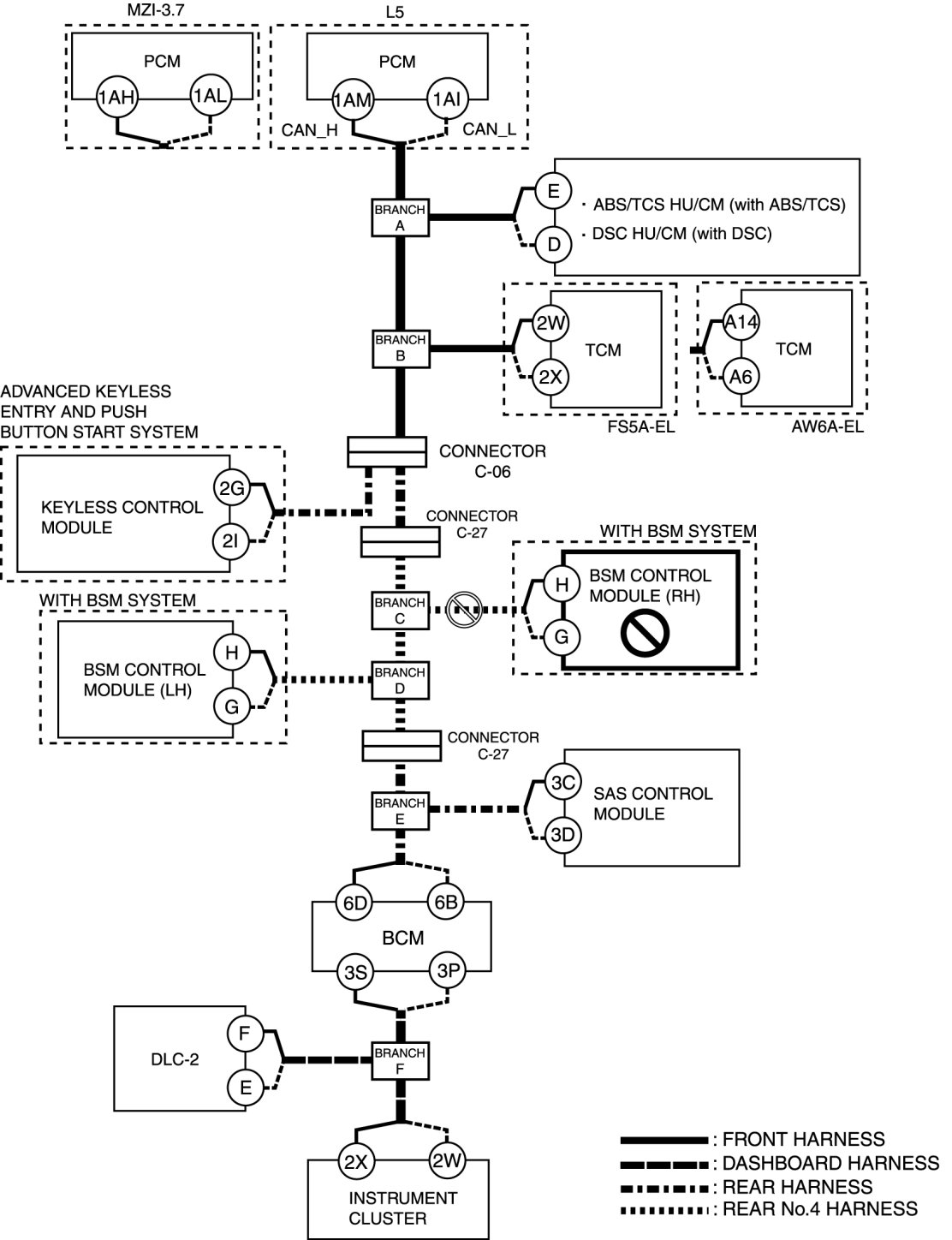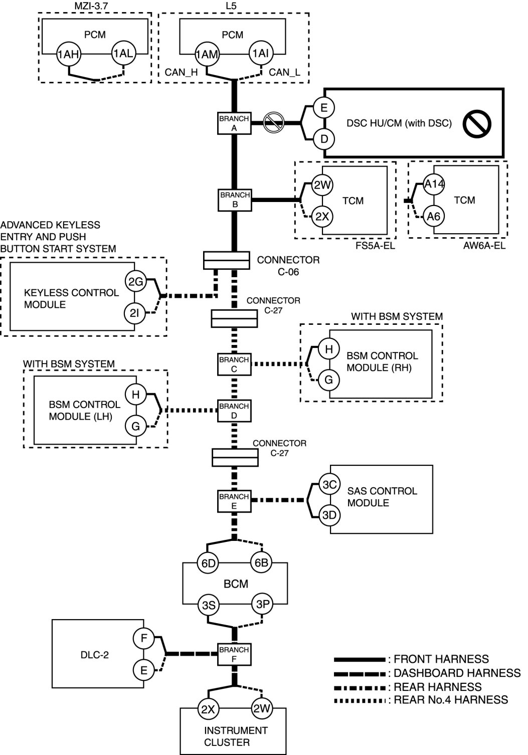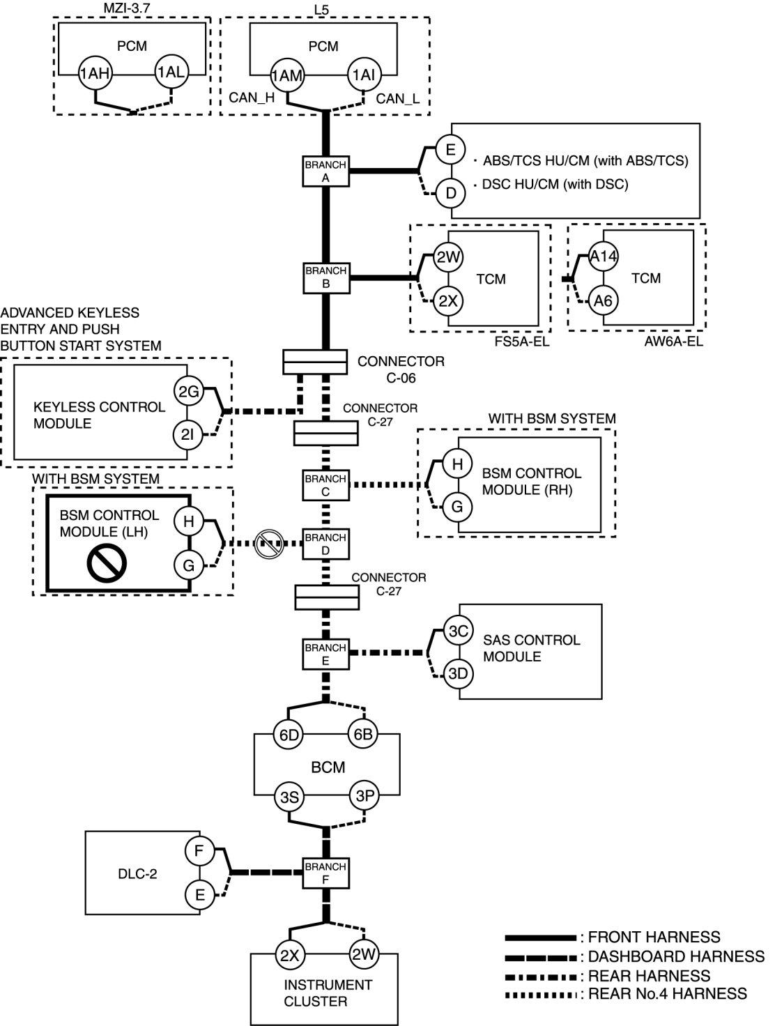 - Wiring harness between DSC HU/CM terminal E and branch A