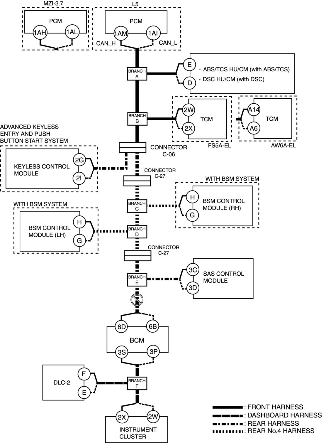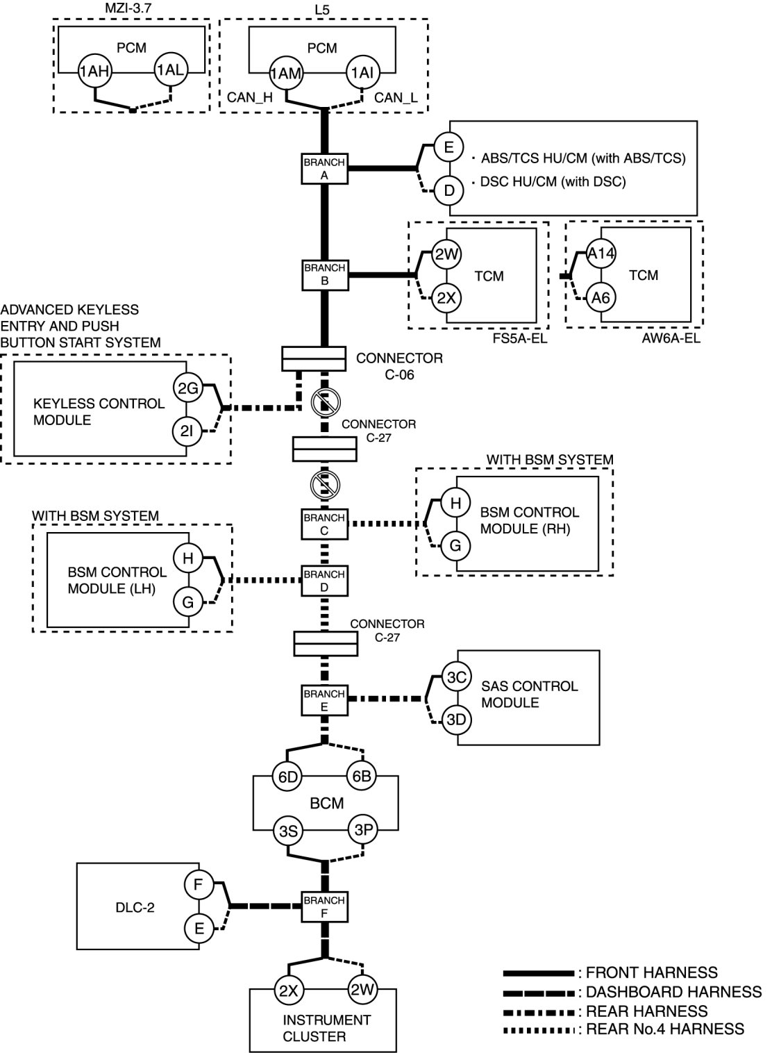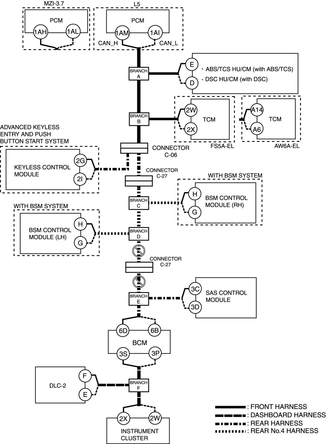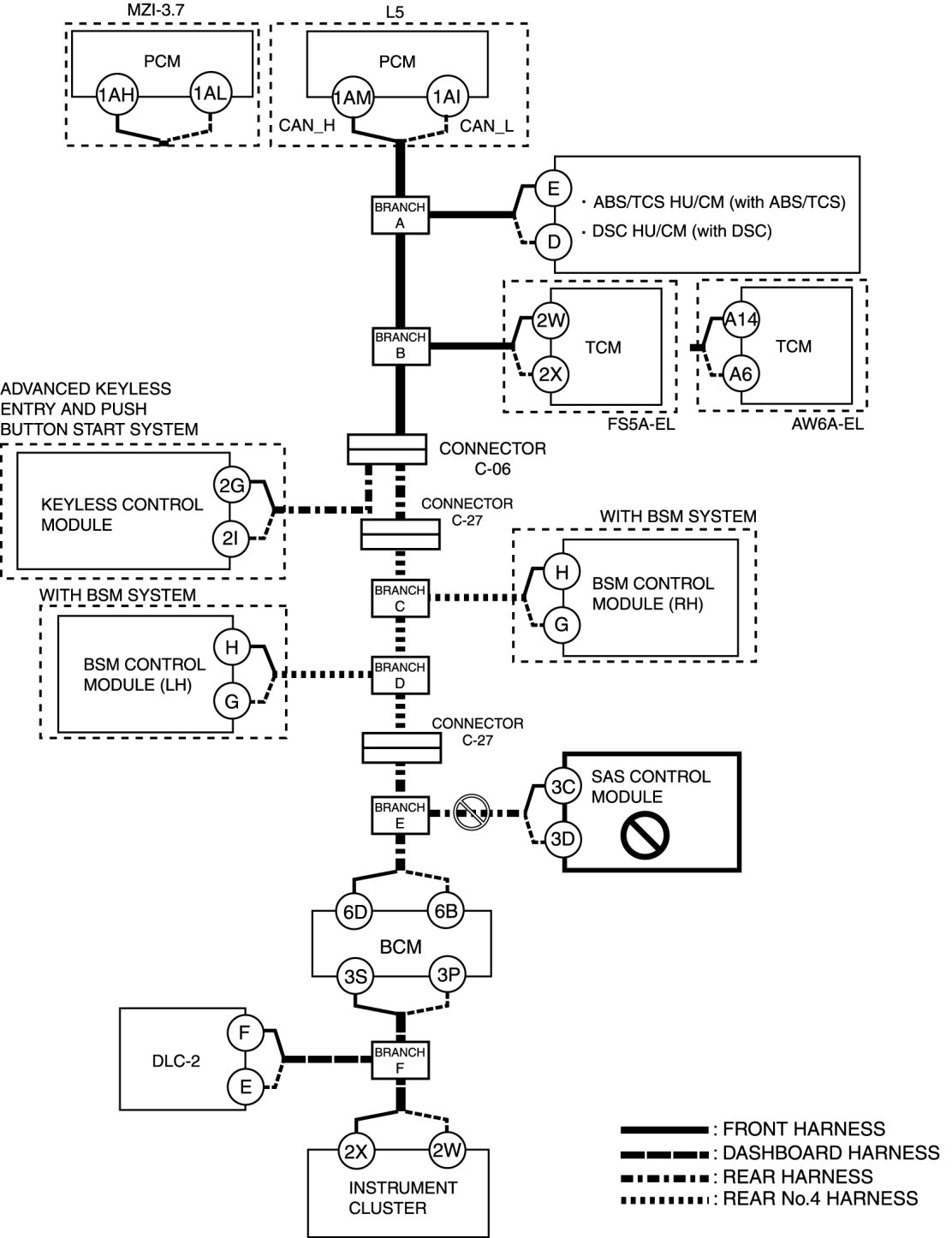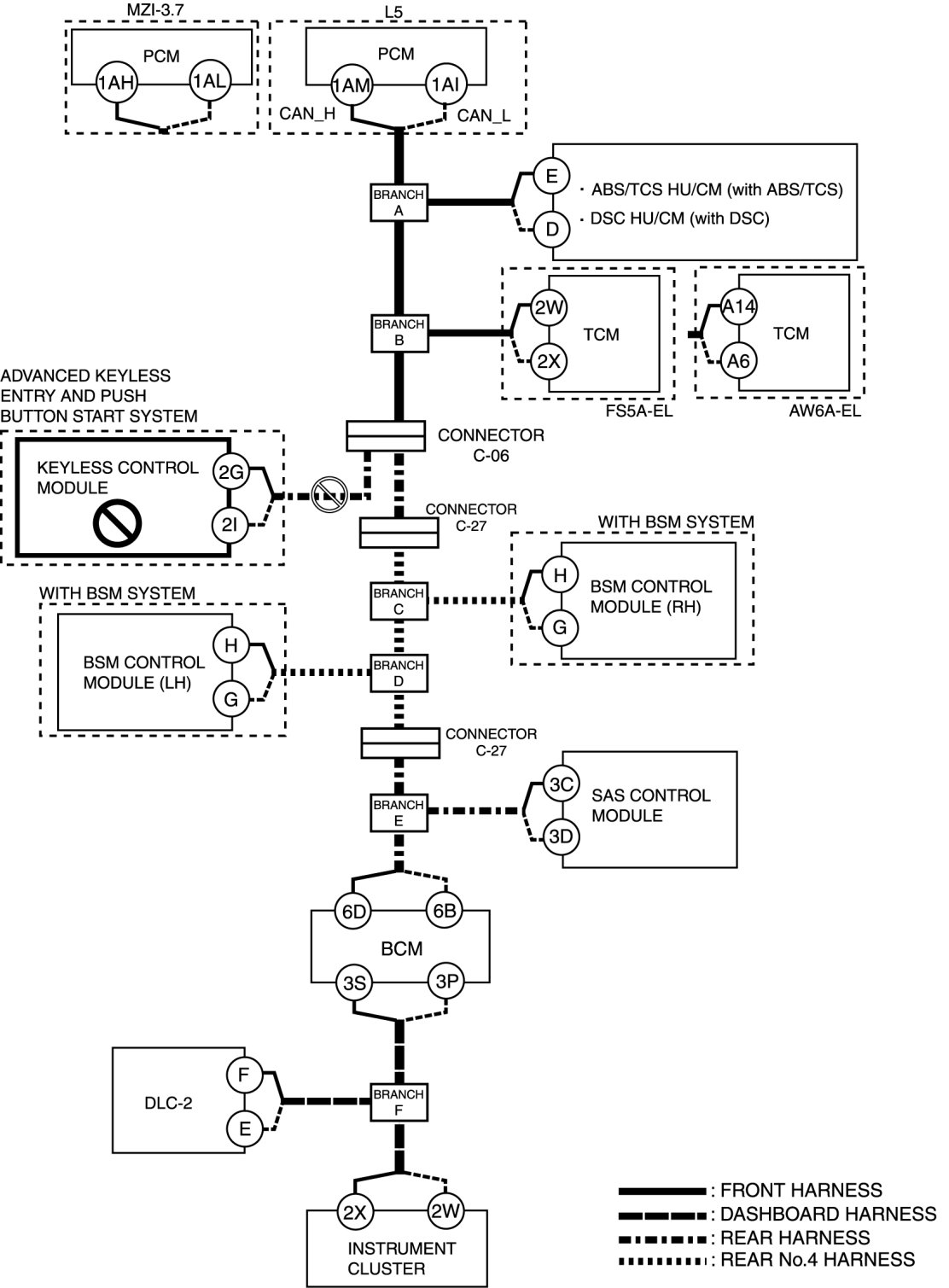 - Wiring harness between DSC HU/CM terminal E and branch A