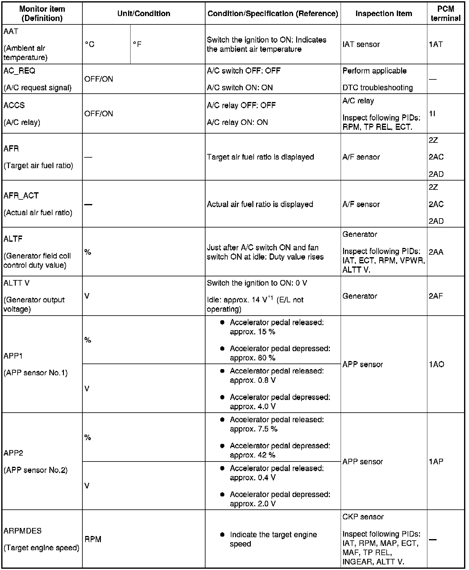 PID/DATA Monitor Table (reference) Part 1: