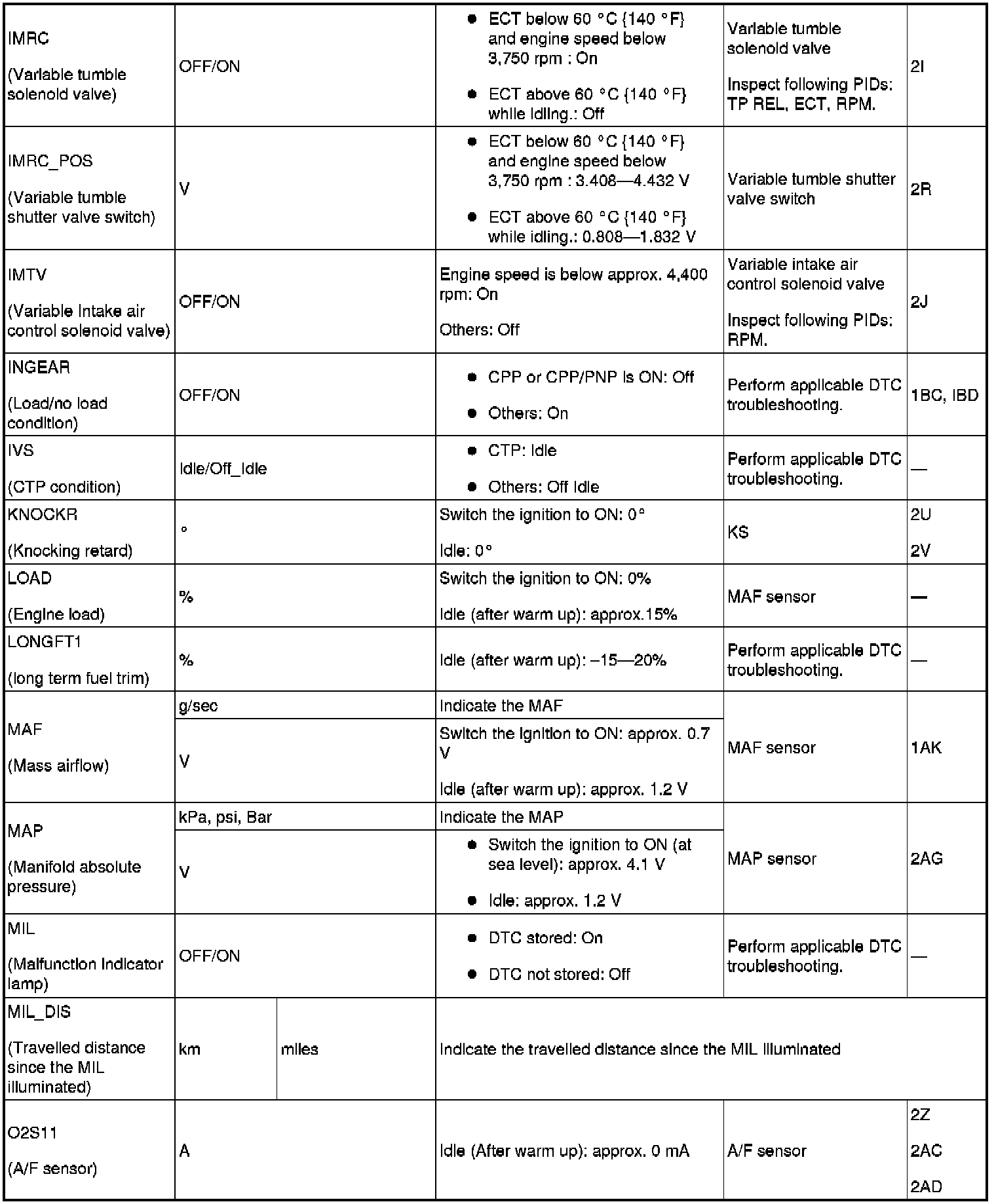 PID/DATA Monitor Table (reference) Part 2:
