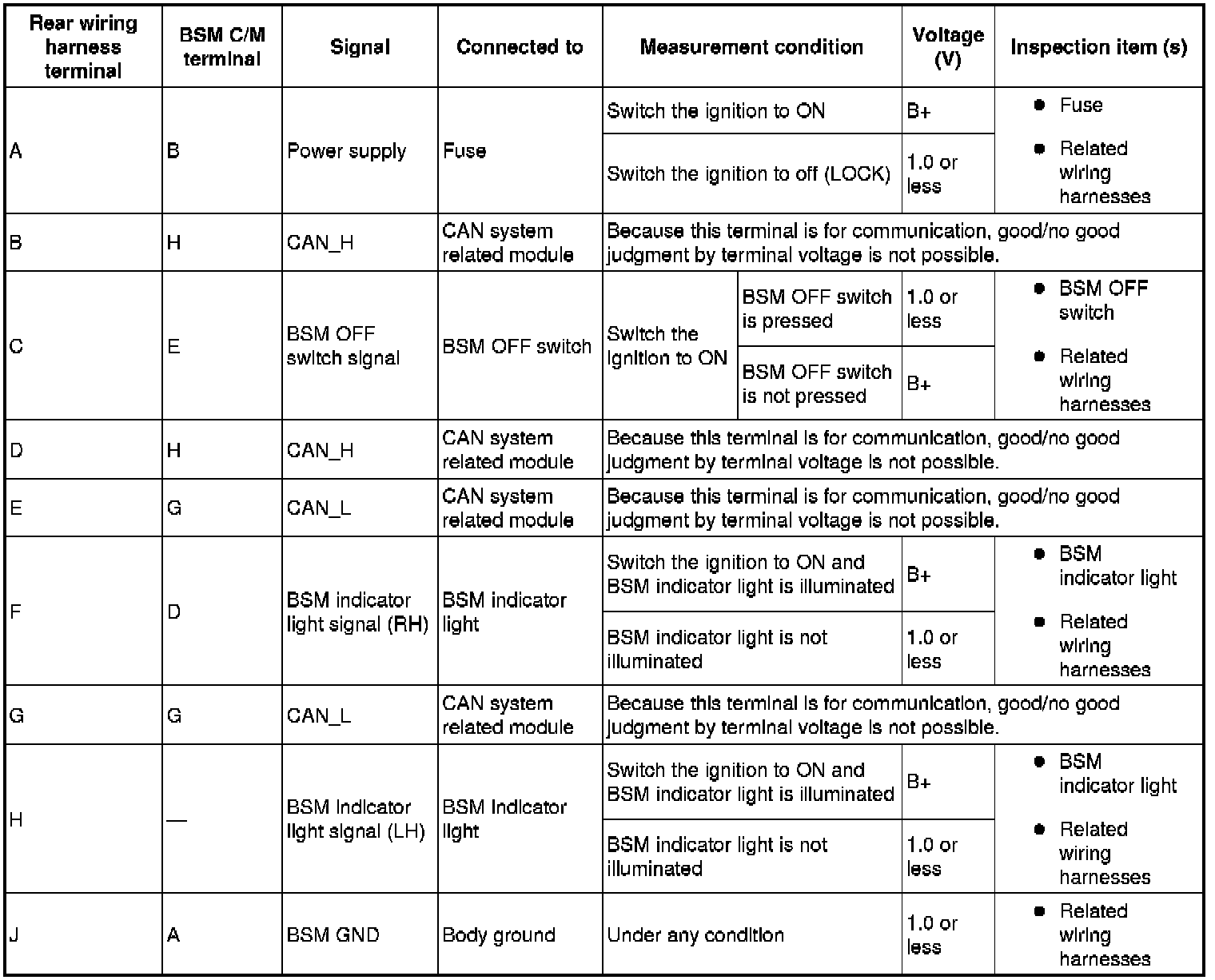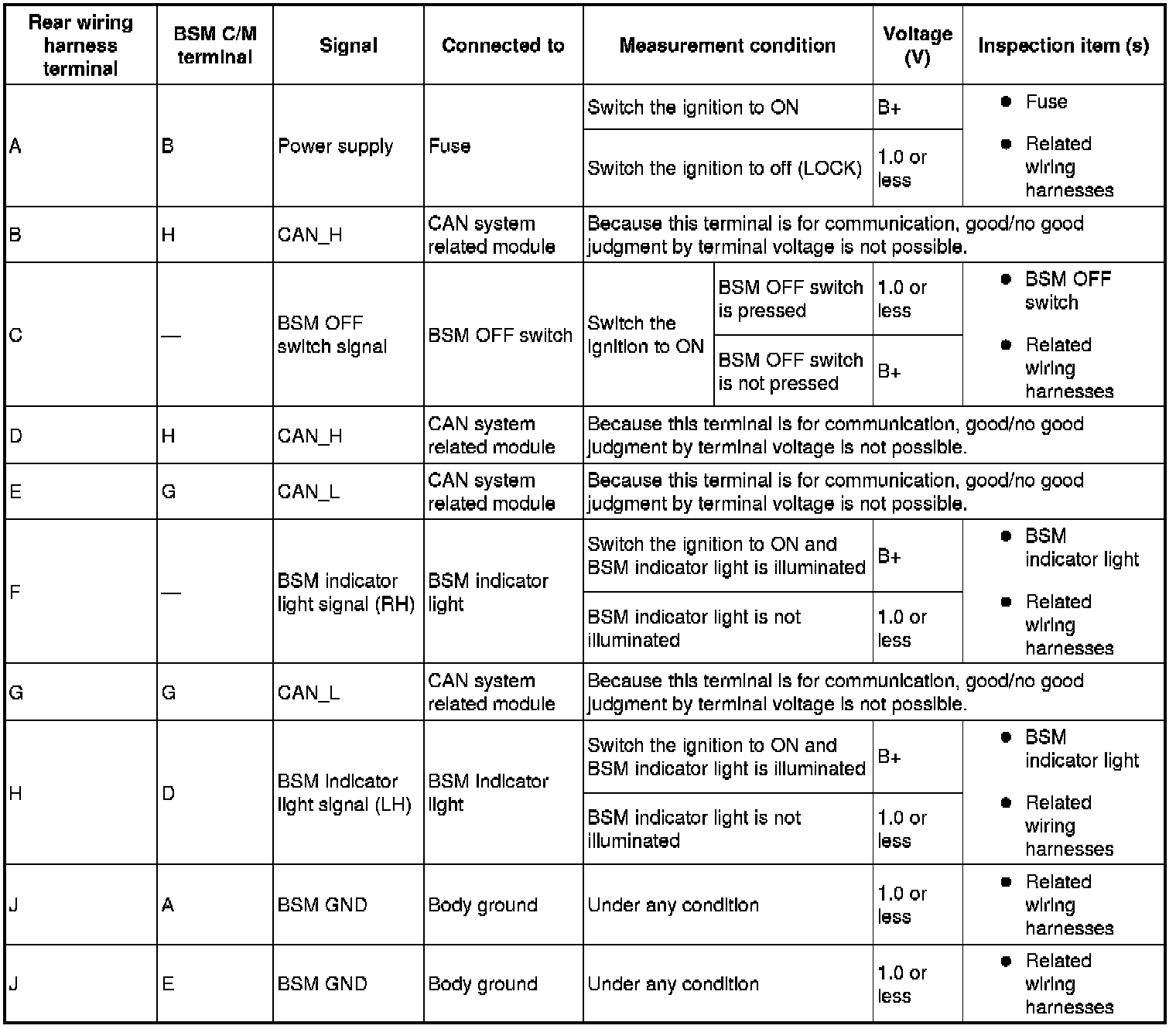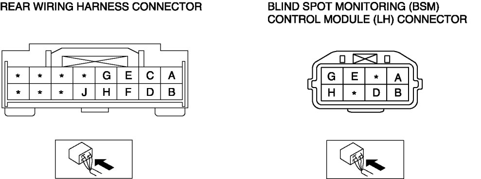 - The BSM control module connector cannot be connected to a tester due to its water-resistance processing, therefore the rear wiring harness connector is used for measuring the terminal voltage.