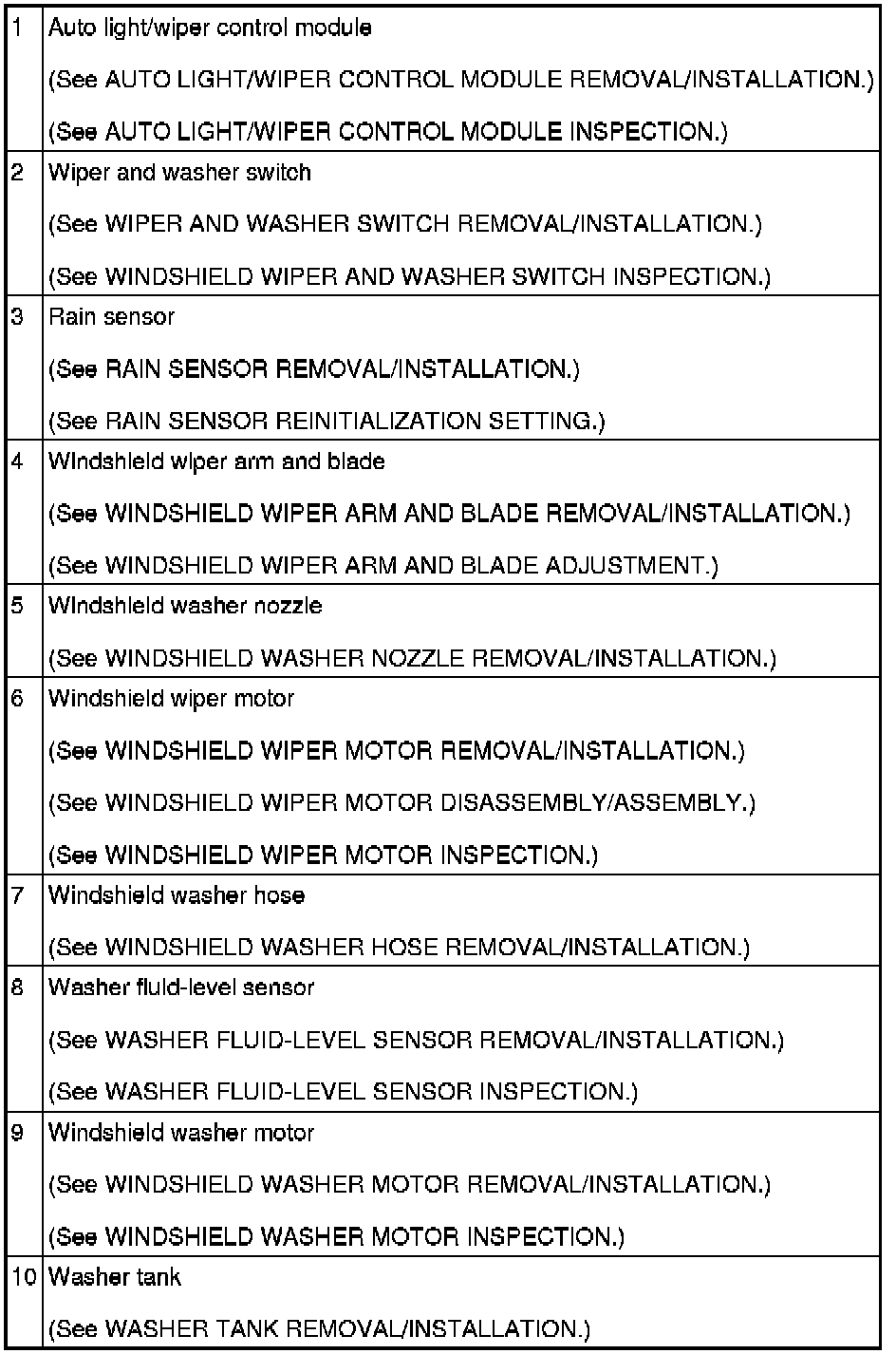 WIPER/WASHER SYSTEM LOCATION INDEX