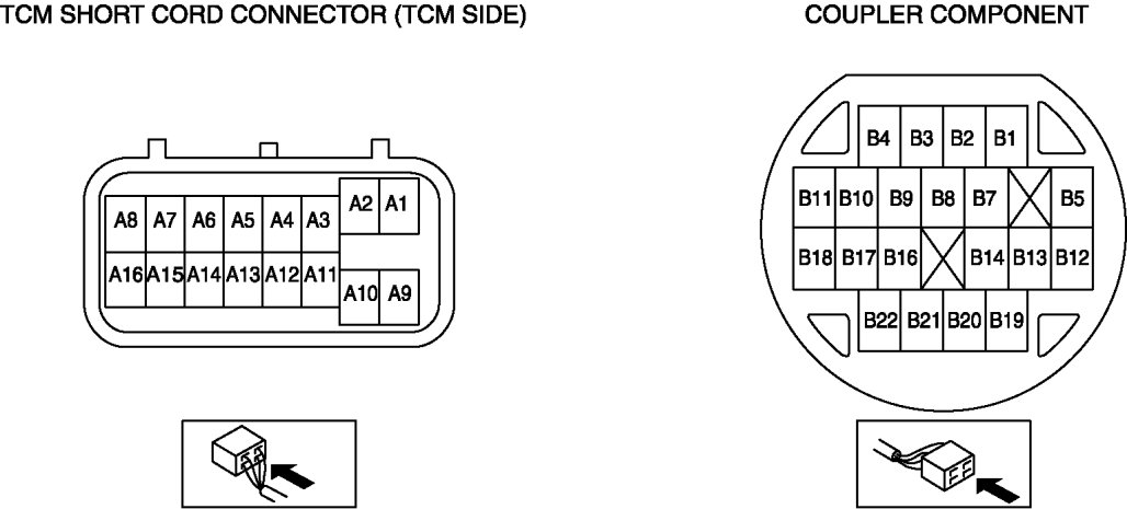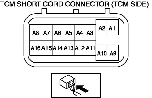 - Use the ground of terminal A9 of the TCM connector (wiring harness-side) when measuring terminal voltage, as an error may occur when connecting the negative circuit tester to ground.