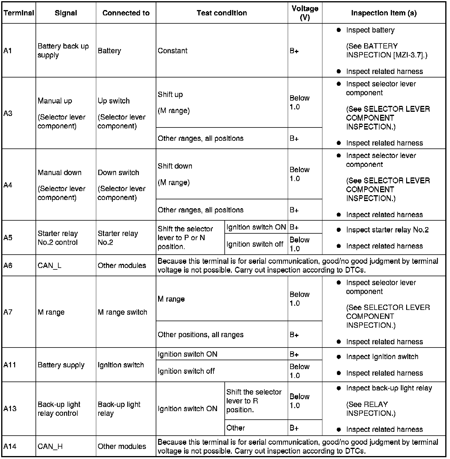 2. Measure the voltage at each TCM connector (wiring harness-side) terminal and refer to the terminal voltage table.