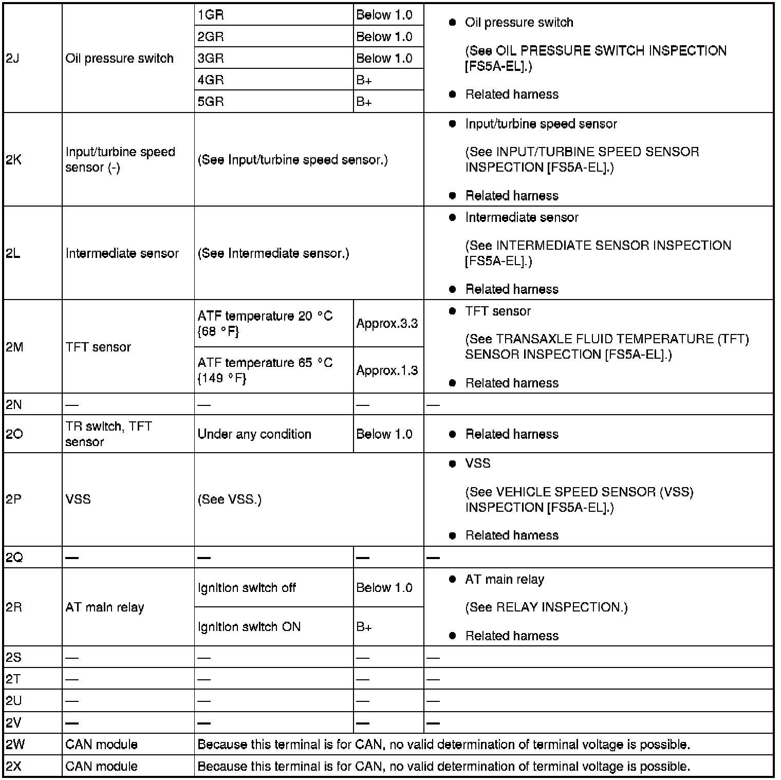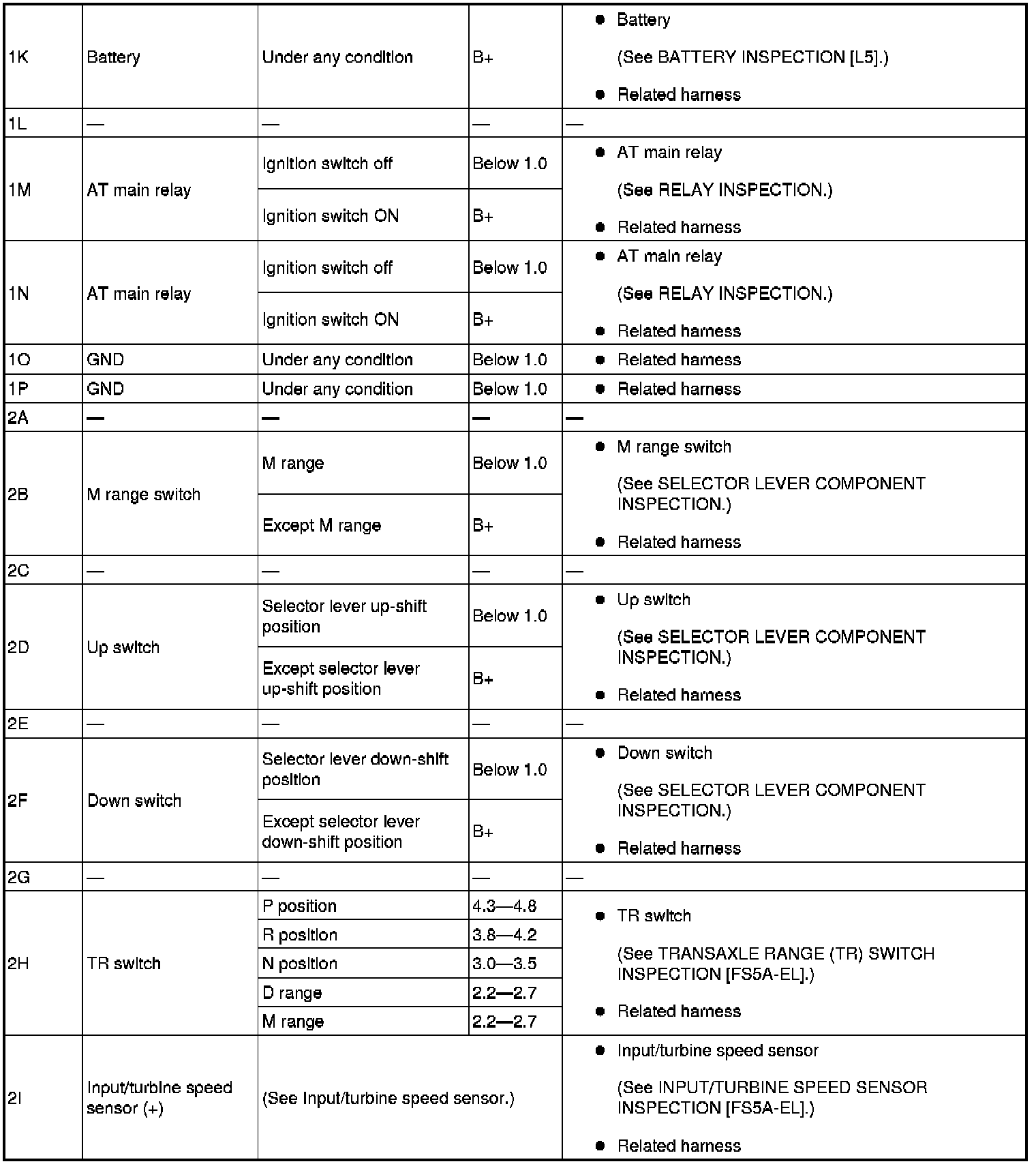 - If any incorrect voltage is detected, inspect the related system(s), wiring harnesses and connector(s) referring to the "Inspection Item" column in the "TCM Terminal Voltage".