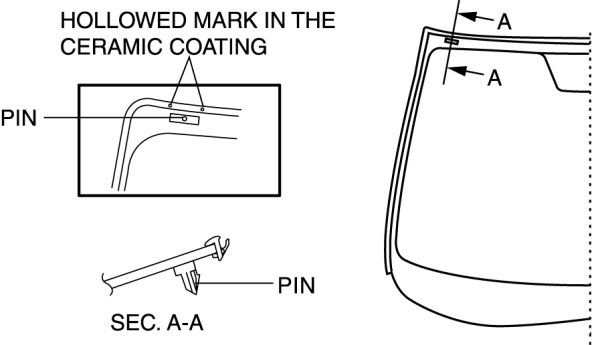 4. Align the alignment marks made before removal and install the pin to the windshield referring to the figure. (Reusing glass, pin removed)