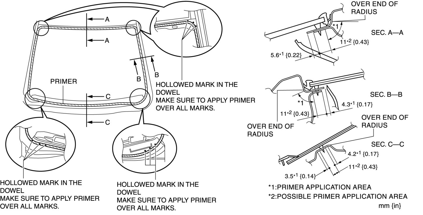 6. Apply glass primer on the glass as shown in the figure, then allow it to dry for approx. 30 min.