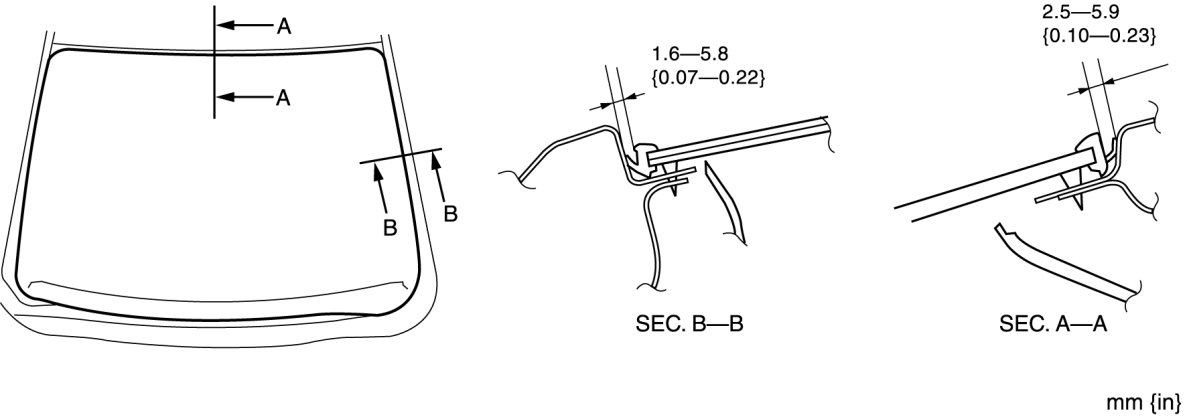 13. Verify that the clearance between the A-pillar and the roof is within the range shown in the figure, and press along the perimeter of the glass.
