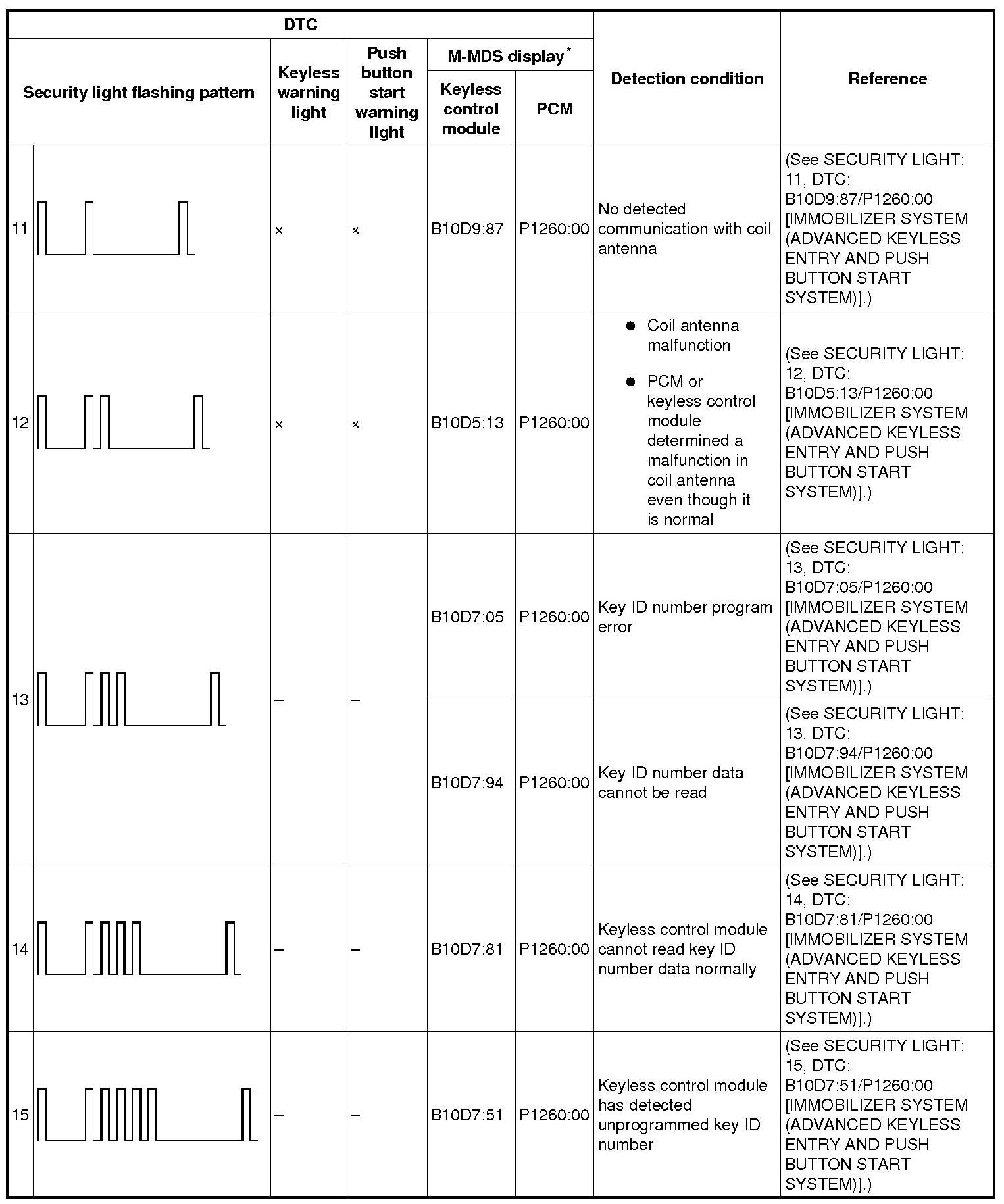 - DTC 21 or higher: Illuminates for approx. 1 min and the DTC flash pattern indicated in the table below repeats 10 times.
