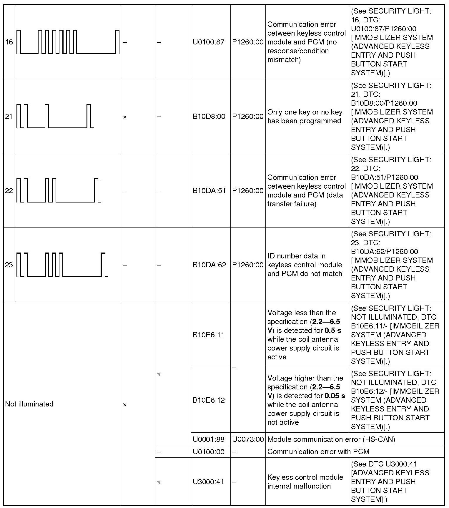DTC Table - Immobilizer System (Advanced Keyless Entry And Push Button Start System)