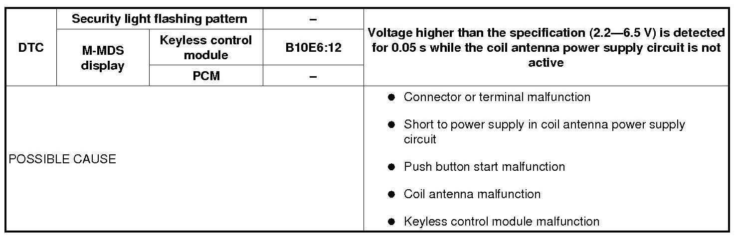 SECURITY LIGHT: NOT ILLUMINATED, DTC B10E6:12/- [IMMOBILIZER SYSTEM (ADVANCED KEYLESS ENTRY AND PUSH BUTTON START SYSTEM)]