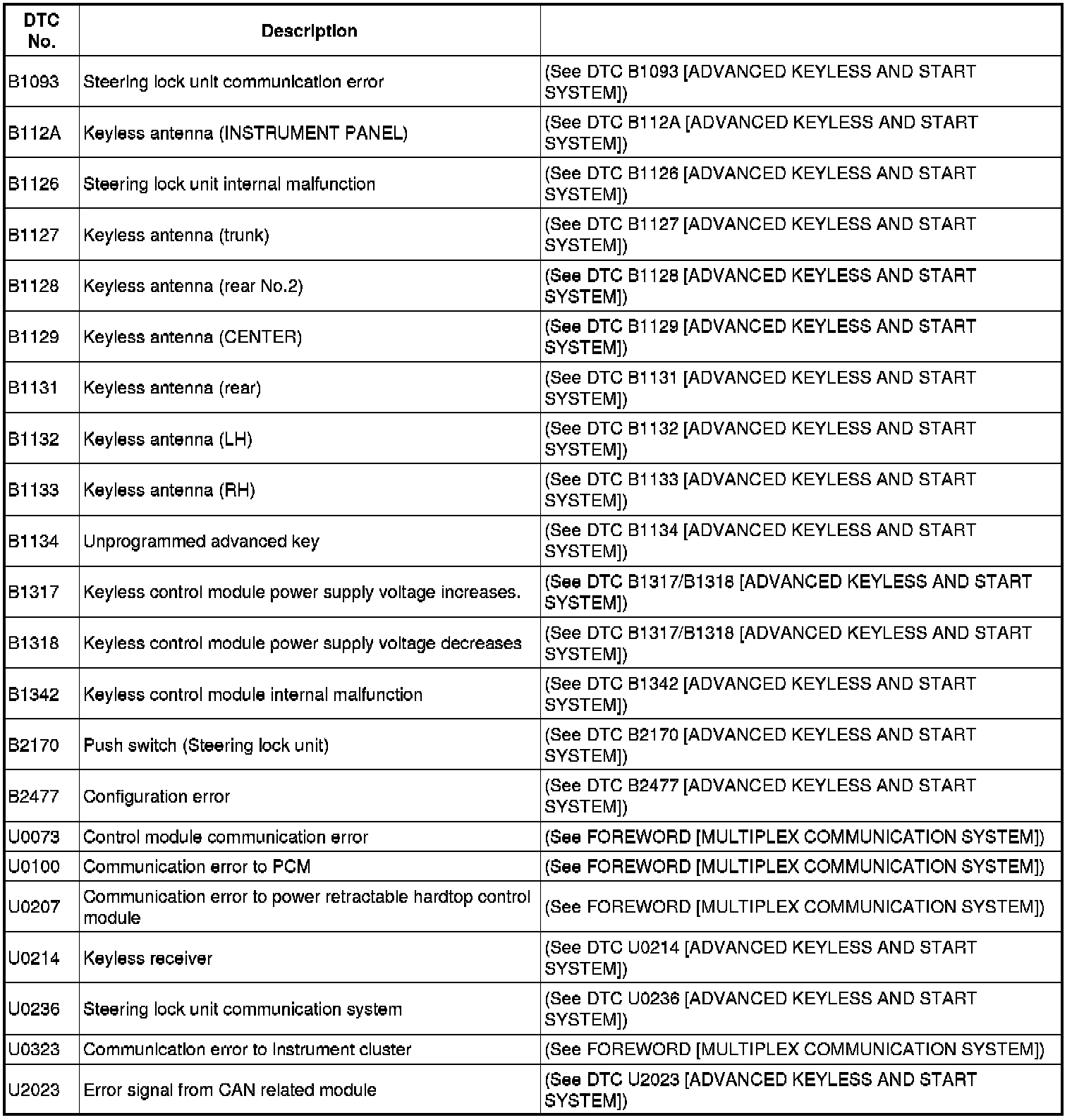 DTC TABLE [ADVANCED KEYLESS AND START SYSTEM]