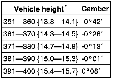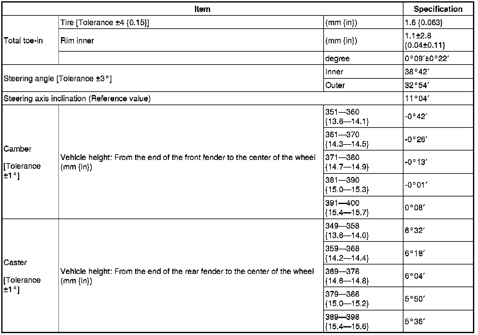 - 16-inch wheel: 1.1±2.6 mm {0.04±0.10 in} (0°09′±0°22′)