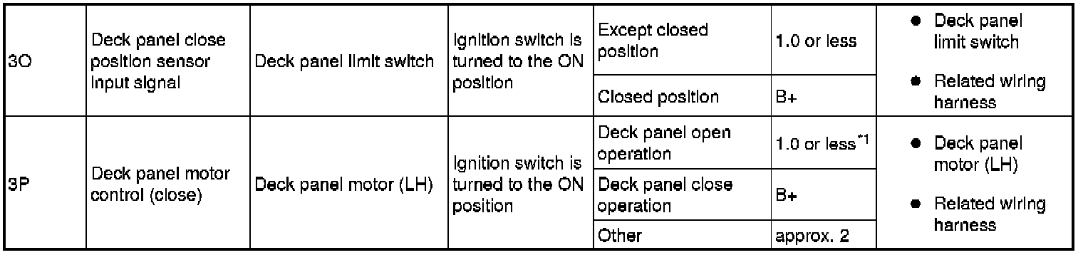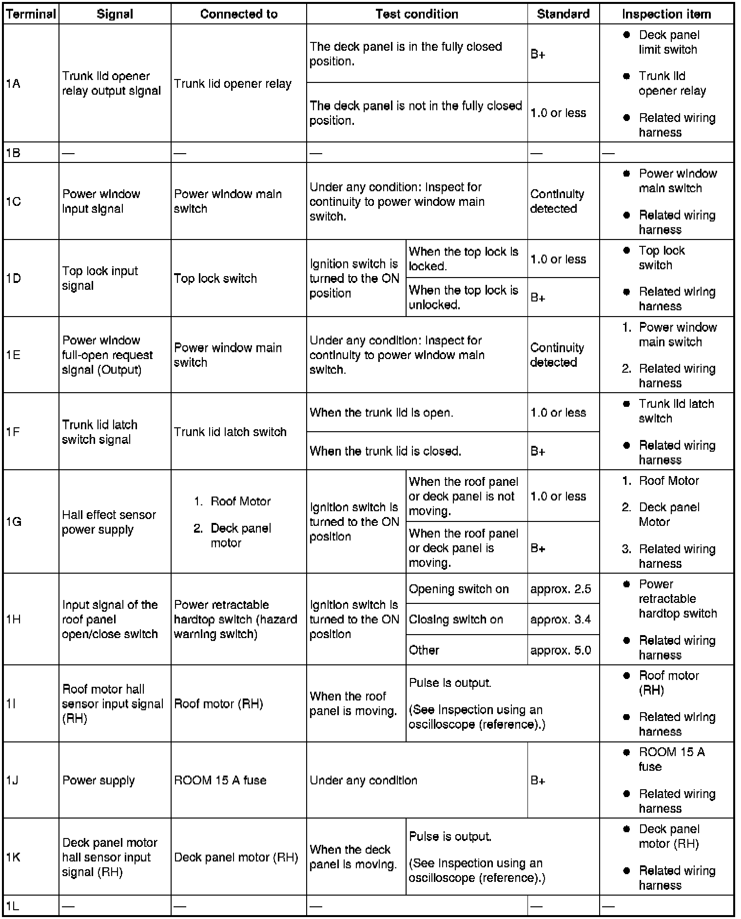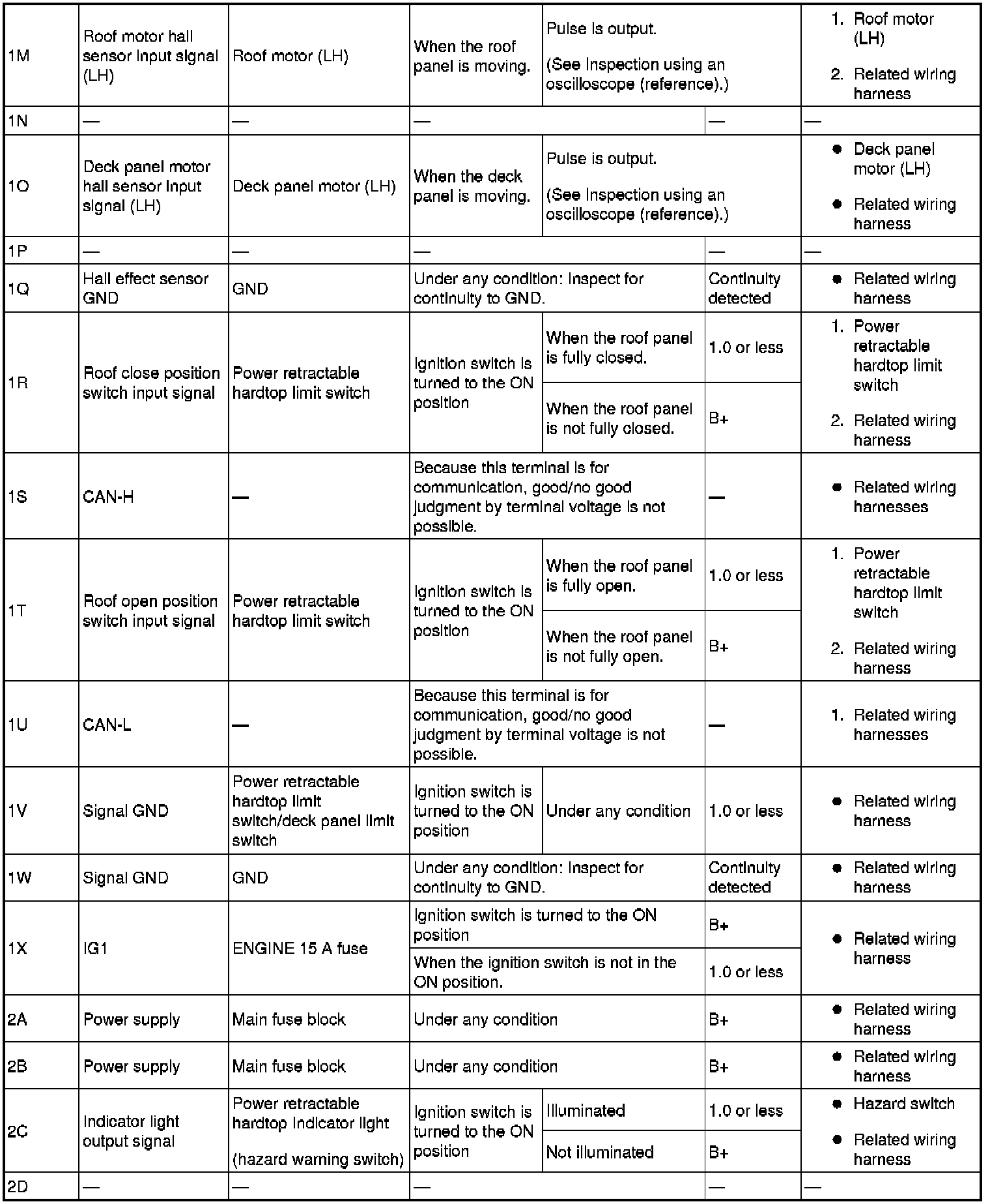 2. Attach the tester lead to the power retractable hardtop control module wiring harness-side connector and inspect voltage, continuity, or resistance according to the standard (reference) on the table.