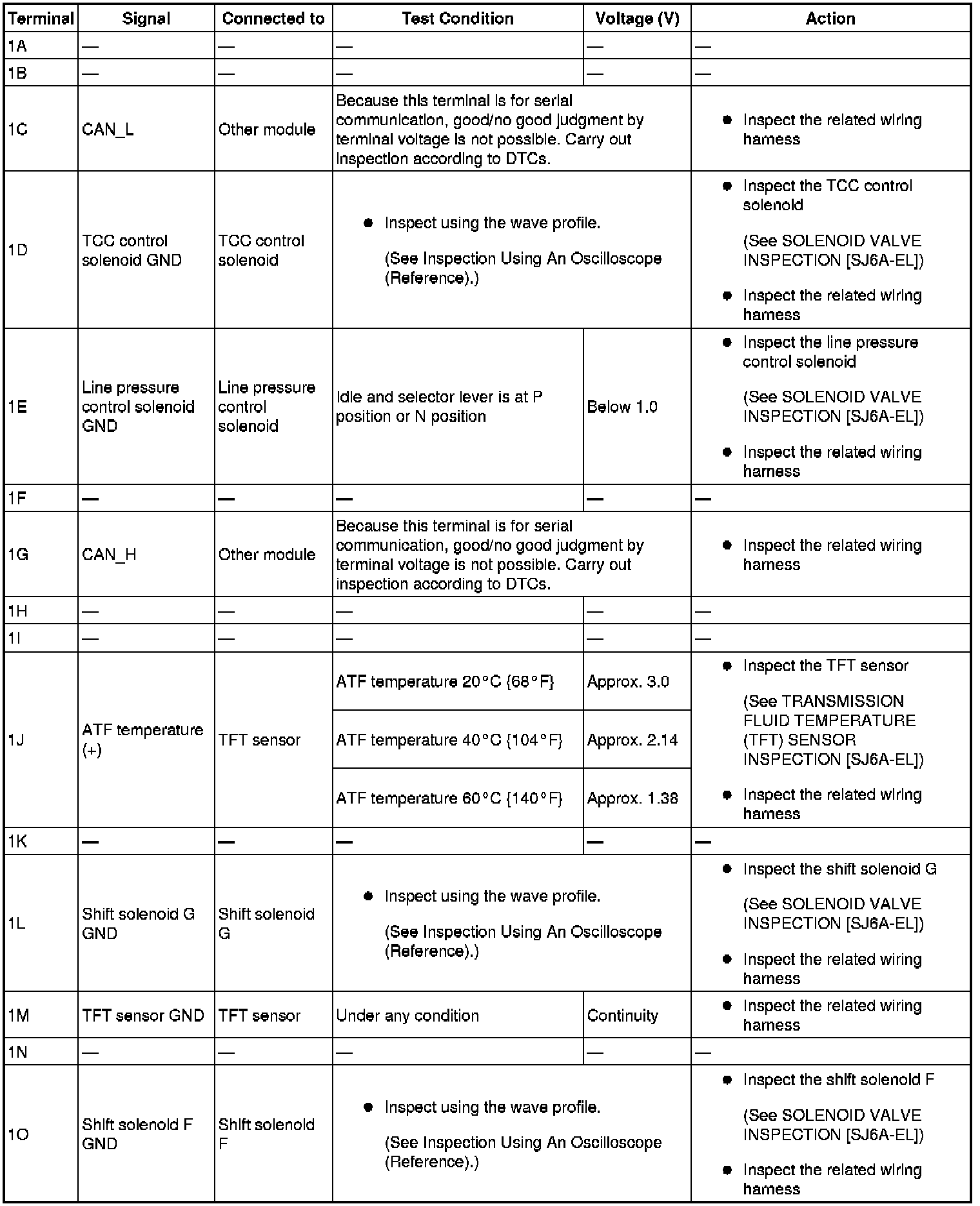 - Use the ground of terminal 1P and 1X of the TCM when measuring terminal voltage, as an error may occur when connecting the negative circuit tester to ground.