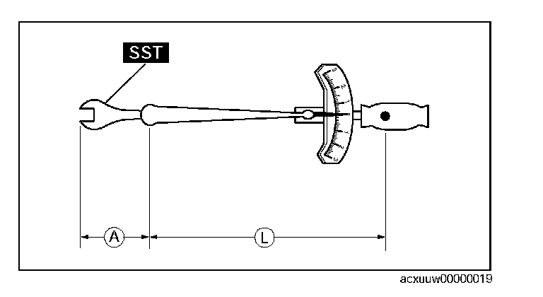 ^ When using a torque wrench-SST or equivalent combination, the specified torque must be recalculated due to the extra length that the SST or equivalent adds to the torque wrench. Recalculate the torque by using the following formulas. Choose the formula that applies to you.