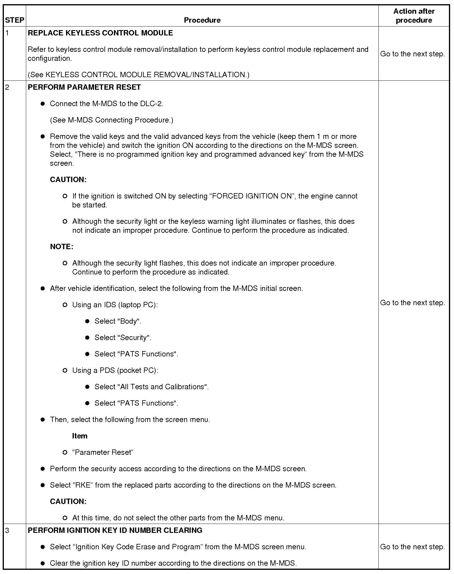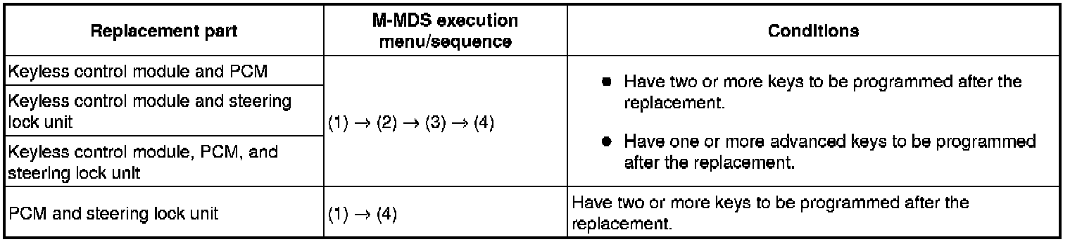 - When replacing the keyless control module or the steering lock unit, remove the valid keys and the valid advanced keys from the vehicle (keep them 1 m or more from the vehicle) and switch the ignition ON according to the directions on the M-MDS screen. Select, "There is no programmed ignition key and programmed advanced key" from the M-MDS screen.