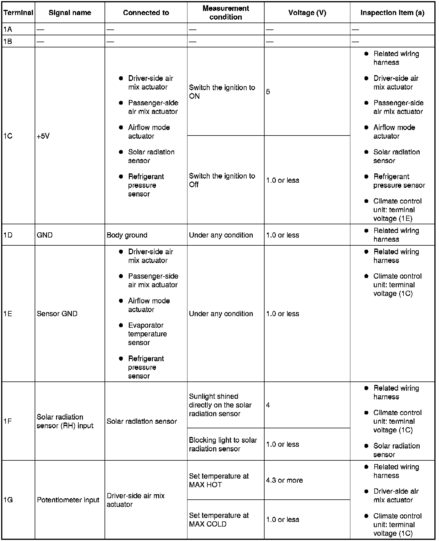 - If the parts under "Inspection item (s)" are found to be normal (except for terminal 1M), replace the climate control unit.