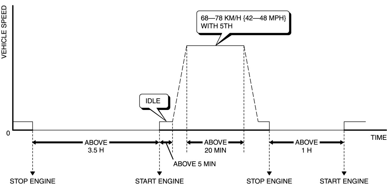 5. With the vehicle stopped, race the engine at the engine speed indicated, and then drive the vehicle as shown in the graph. The driving conditions before driving at constant speed are not specified. If possible, monitor RPM PID for engine speed during this procedure.