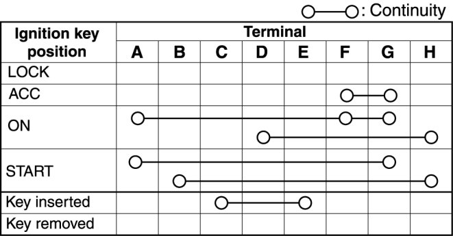 - If not as indicated in the table, replace the ignition switch.