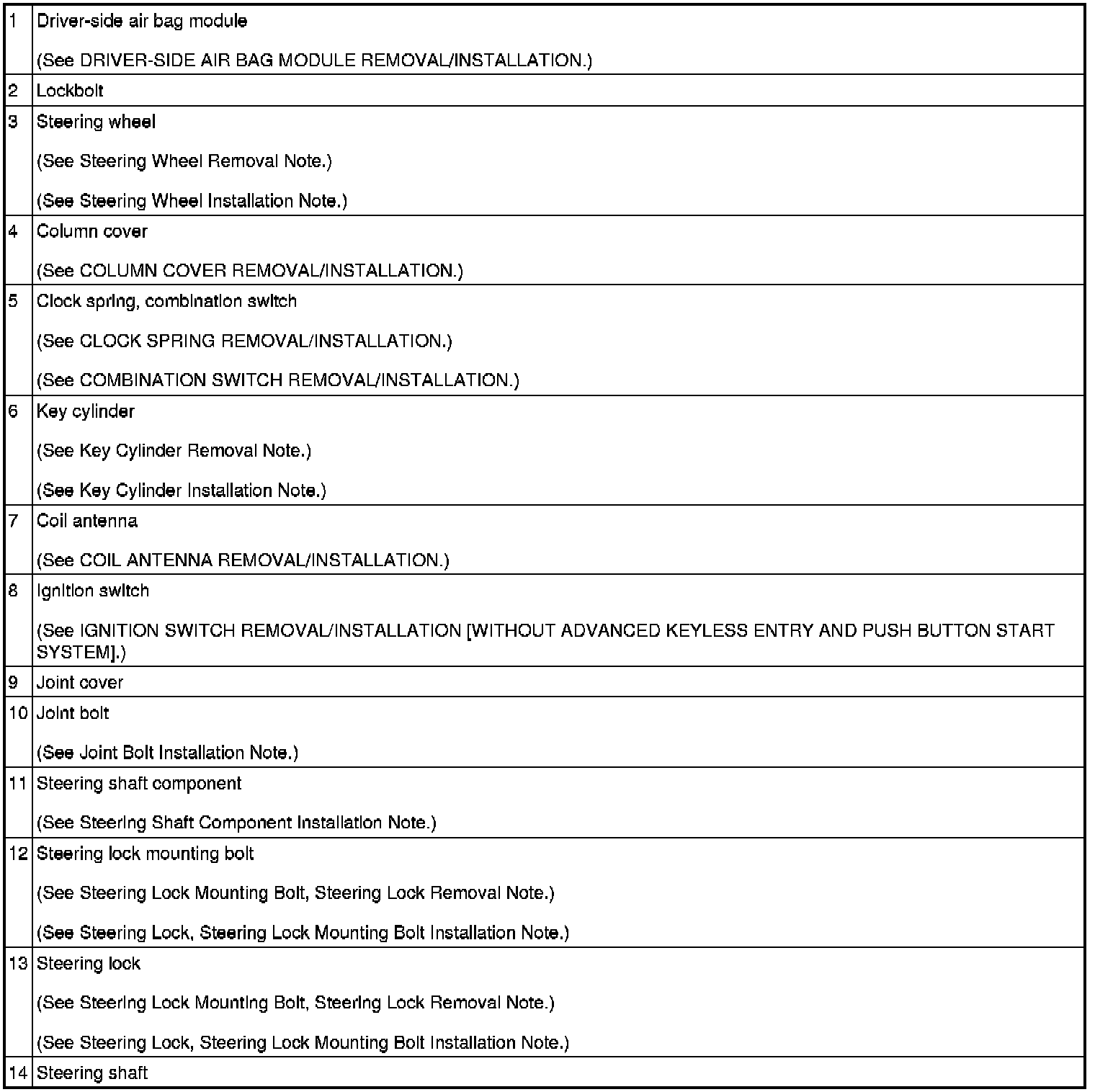 STEERING WHEEL AND COLUMN REMOVAL/INSTALLATION [WITHOUT ADVANCED KEYLESS ENTRY AND PUSH BUTTON START SYSTEM]