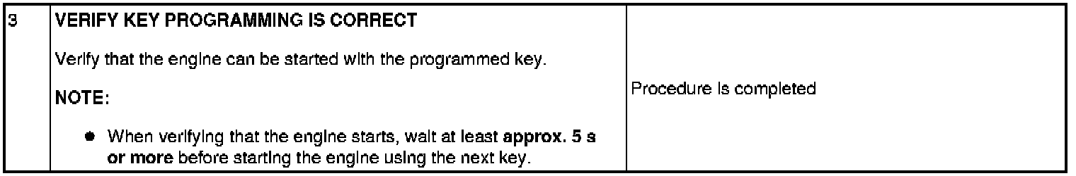 - If the engine is started during immobilizer system-related parts programming, the programming mode cancels. Therefore, do not start the engine unless indicated in the procedure. Repeat the procedure from the beginning if the engine is started during the immobilizer system-related parts programming.