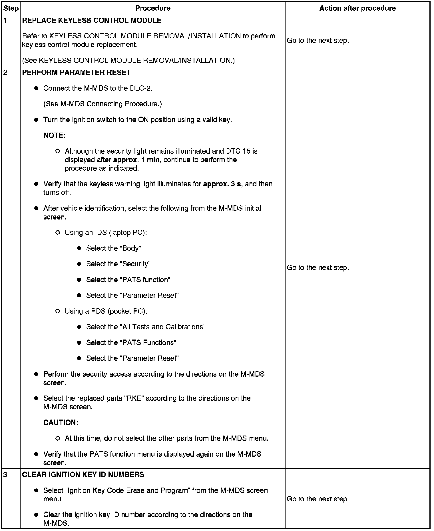 Immobilizer System-Related Parts Service and Programming Procedure Table