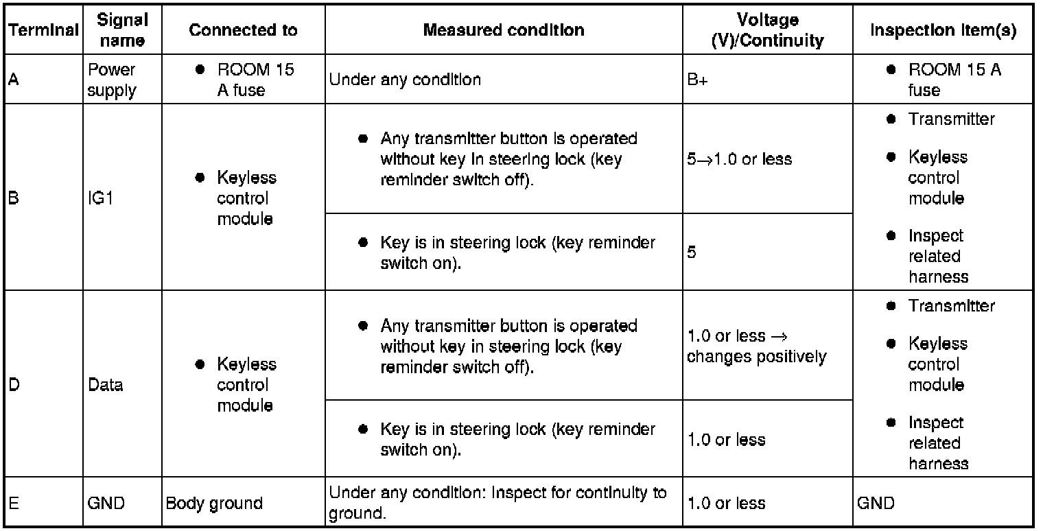 - If the voltage is not as specified in the Terminal Voltage Table (Reference), inspect the parts under "Inspection item (s)".