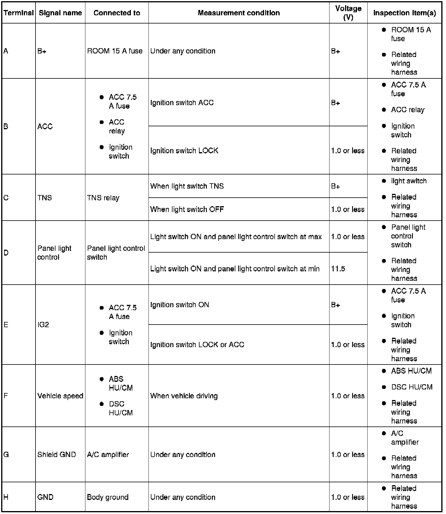 3. By inserting the positive (+) lead of the tester into each climate control unit terminal, measure the voltage according to the terminal voltage table.