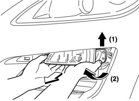 4. Hold the back surface of the front fog light and lift it up as shown in the left diagram. Then arc the front fog light as pull it out from the vehicle body with care not to contact the oil cooler.