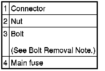1. Press the tabs in the direction indicated by the arrows, lift the main fuse block, and then remove the bolt.