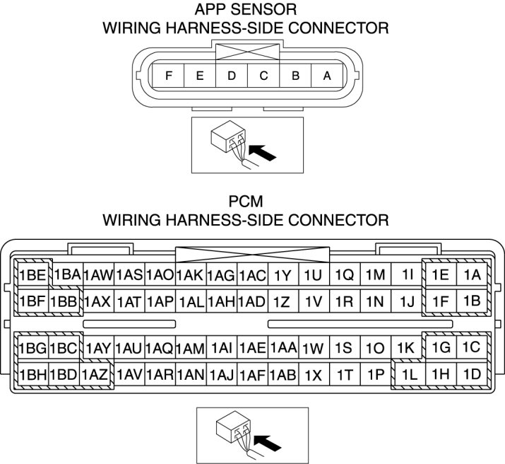 3. Verify that the voltage at PCM terminals 1AO (M-MDS PID: APP1) and 1AP (M-MDS PID: APP2) is as indicated in the table.
