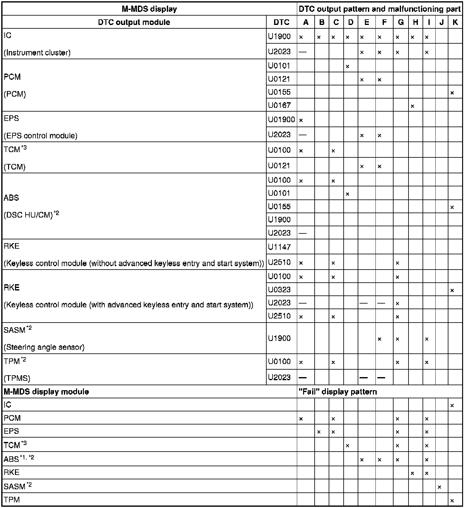 - A hyphen (-) in the DTC output pattern cell indicates that the DTC may be displayed depending on the malfunction detection conditions. If it is not displayed, the malfunctioning part can be determined by checking only the crosses (x).