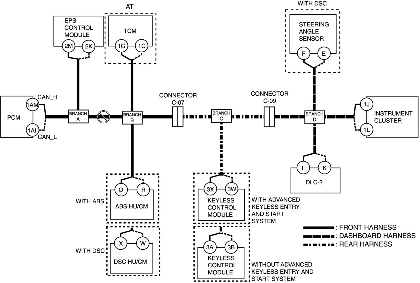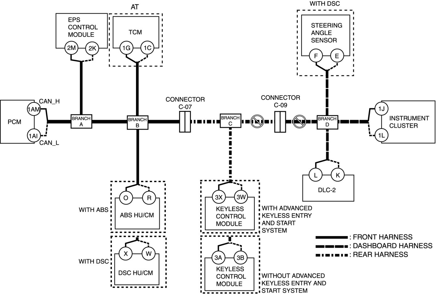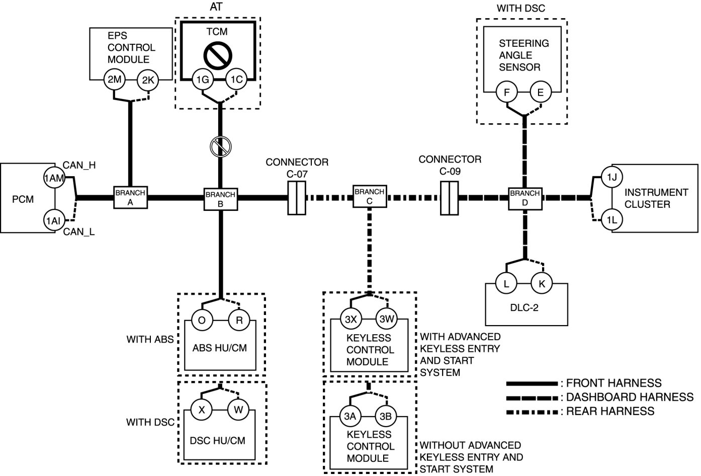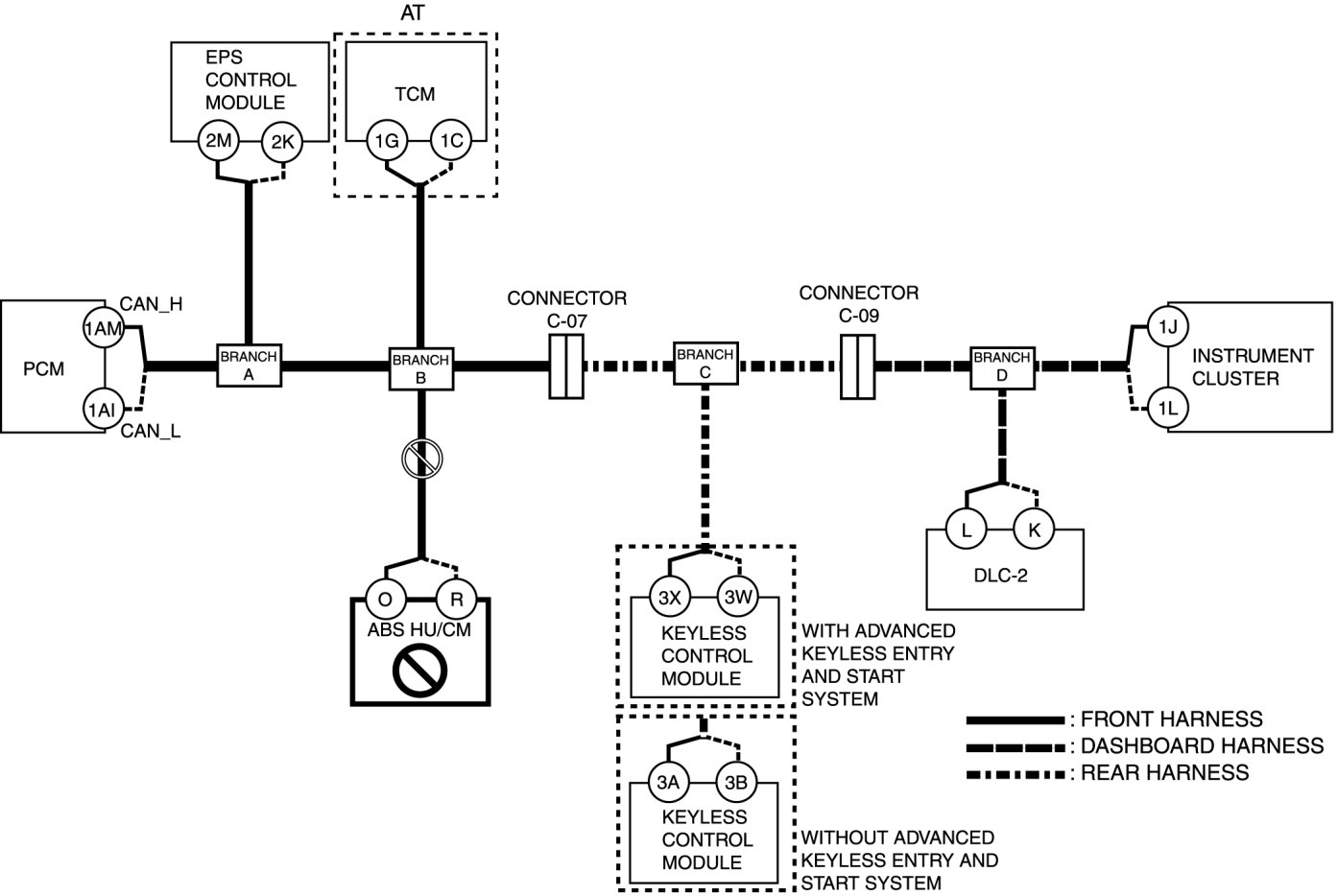 - Wiring harness between keyless control module terminal 3W and branch C